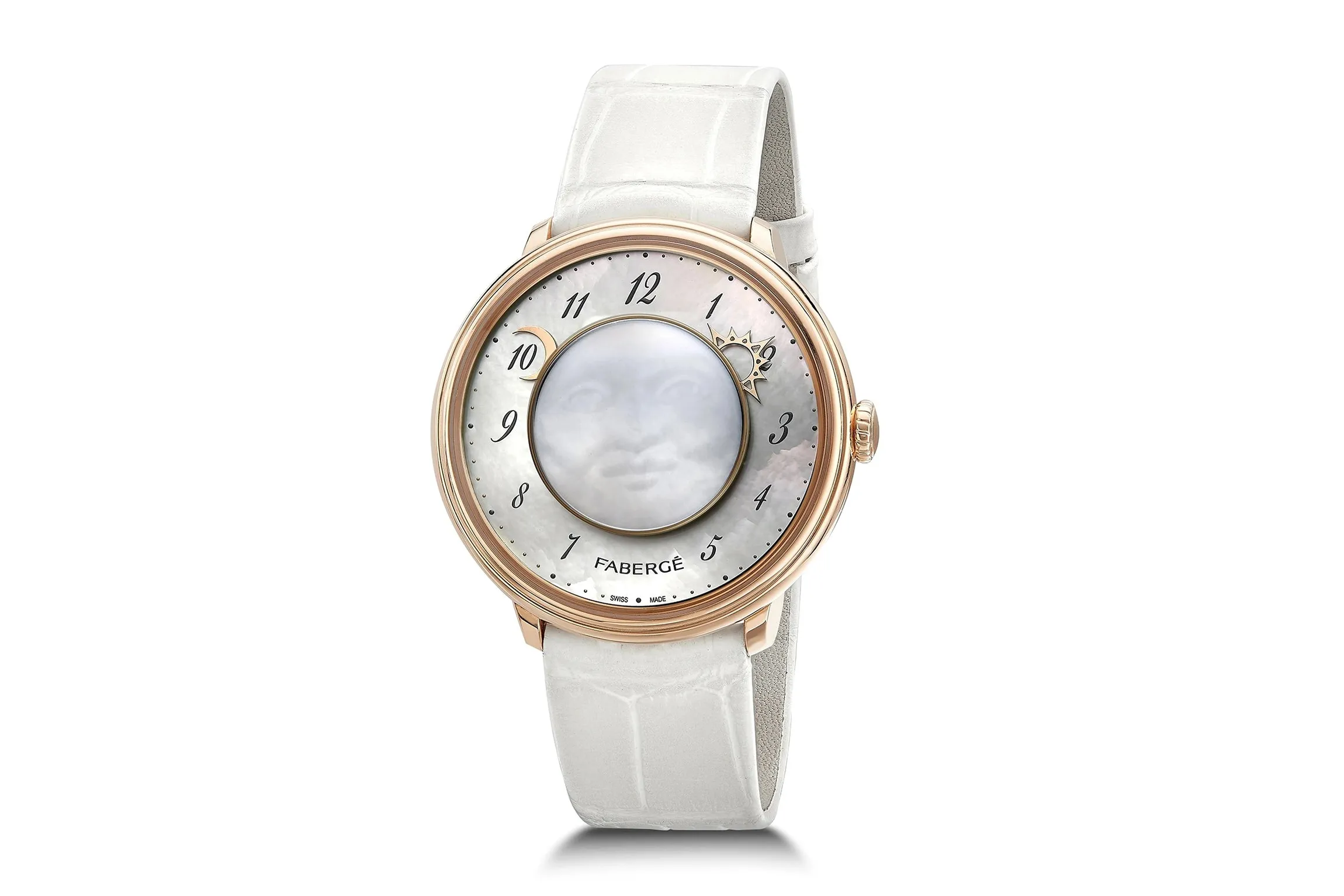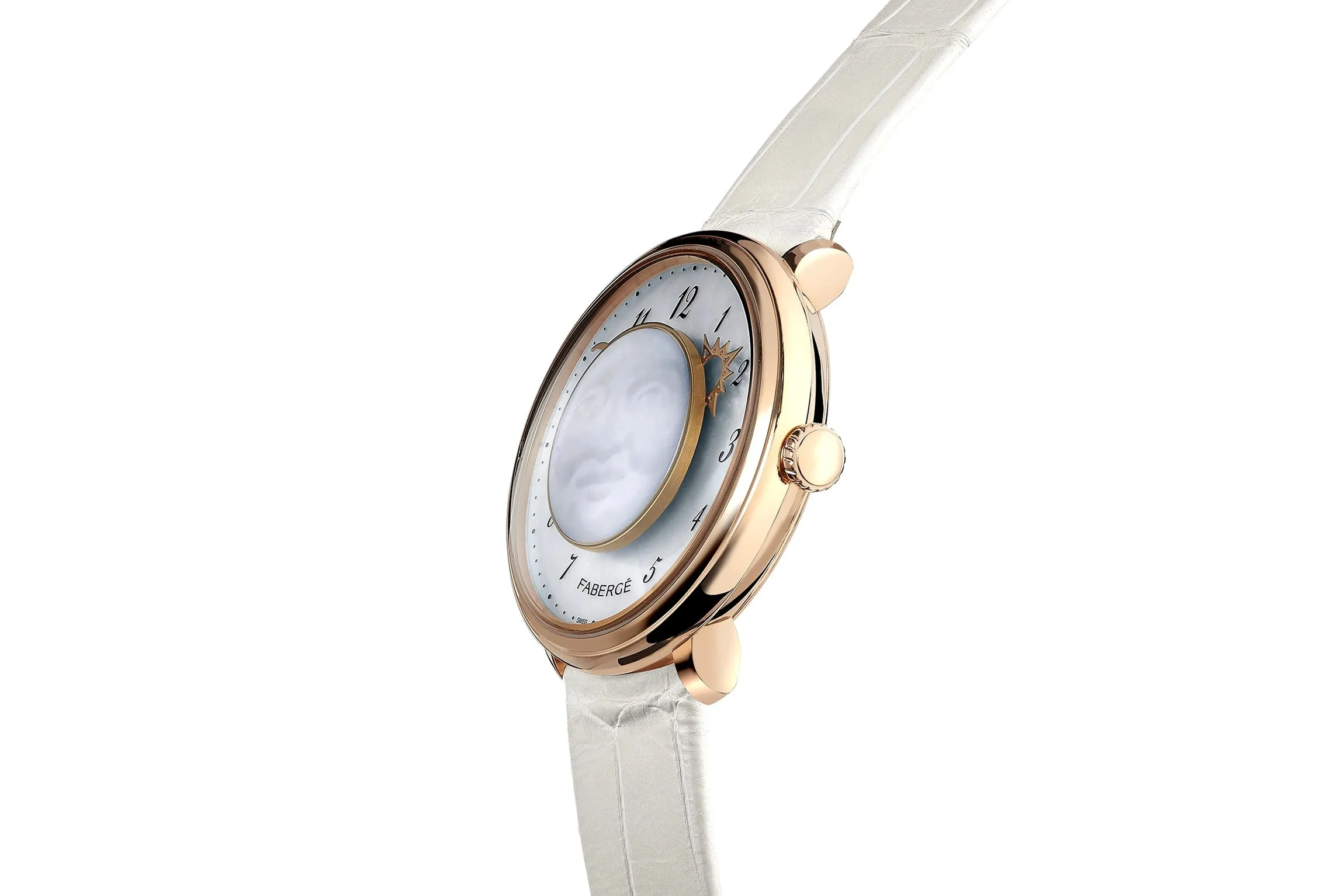 For this model Jean-Marc Wiederrecht and his team of horological experts developed the manual AGH6911 calibre. The 36mm watch makes use of stylised indicators to display the time: a crescent moon for hours and rising sun for minutes, tracking against a white mother-of-pearl ring dial. The Fabergé Lady Levity is presented in 18 karat rose gold with the addition of an alligator strap and 18 karat rose gold pin buckle.