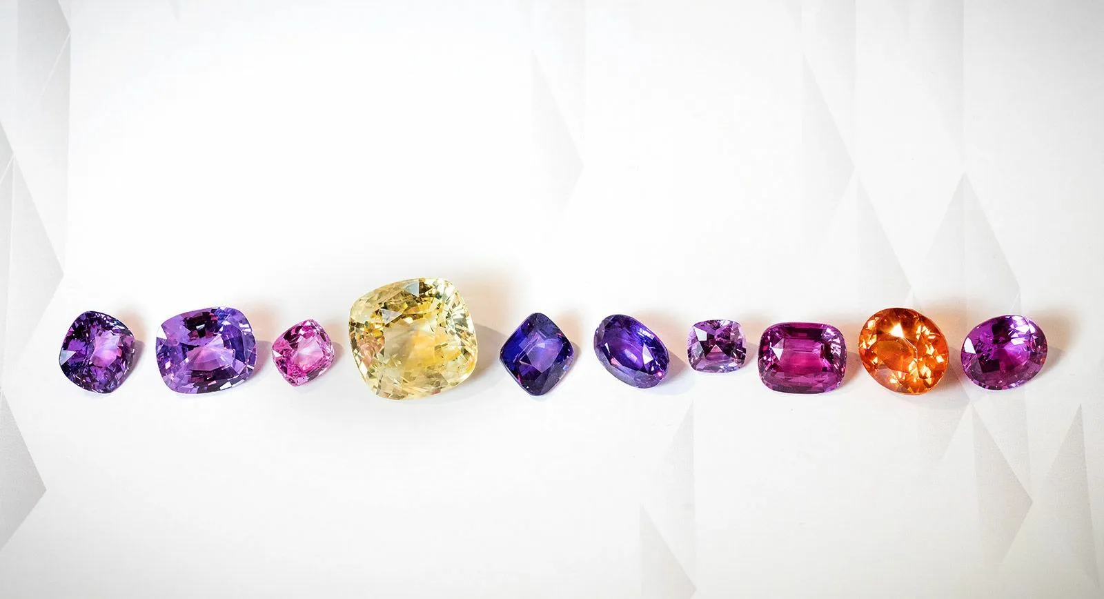 A selection of fancy coloured purple hue sapphires in a variety of cuts from Constantin Wild. Photo by Simon Martner