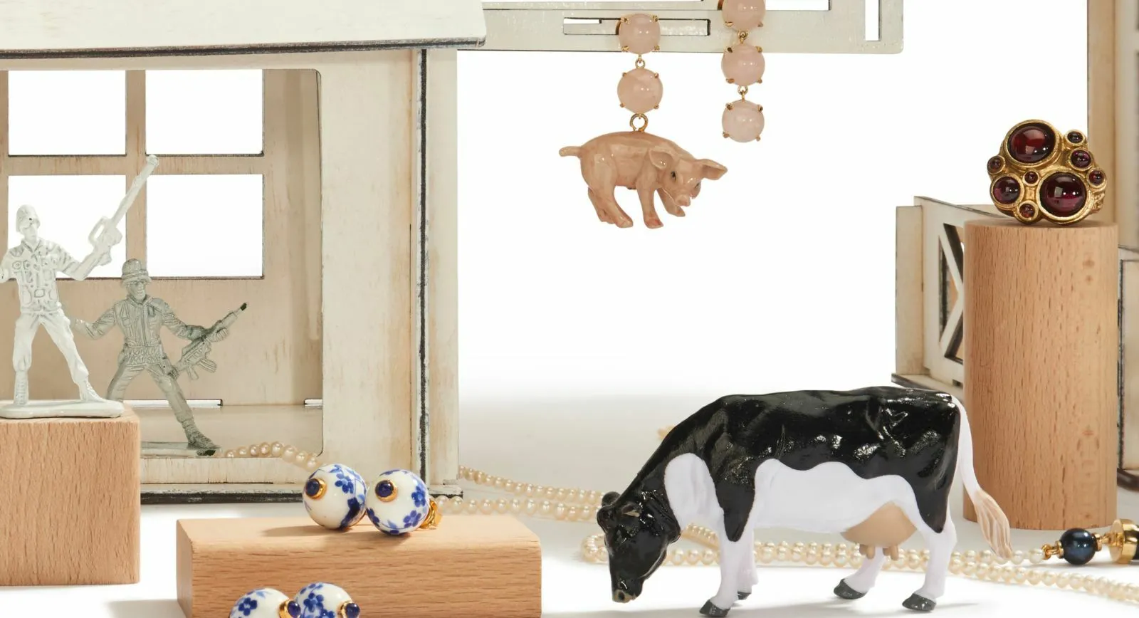 Tessa Packard was presenting three jewellery collections: Fat Free, a collection inspired by British sweets, Predator/Prey, featuring earrings, rings and necklaces with bees, and a unique set of jewels: At All Times. The designer says that the style of her jewellery is the perfect complement to Amanda’s elegant, minimalist hand; and it’s true, the long ‘Brighton Rock’ earrings with diamonds and watermelon tourmalines from the Fat-Free collection look very striking paired up with a plain black evening dress, and the same can be said of the combination of a black silk blouse, jacket and skirt with the ‘Smiling Buddah’ earrings in citrine and carved yellow jade.