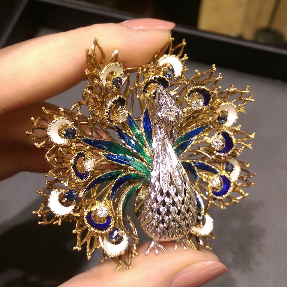 It is not only the floral jewellery that is featured in the catalogue but also an extensive selection of yellow gold and pearl pieces. A set of earrings and a two-row necklace with pink sapphires and pearls wrapped around with a gold thread immediately caught my attention (Lot 187). And then there was another striking piece that stood out – the ornamental gold peacock brooch with enamel and diamonds (Lot 223).