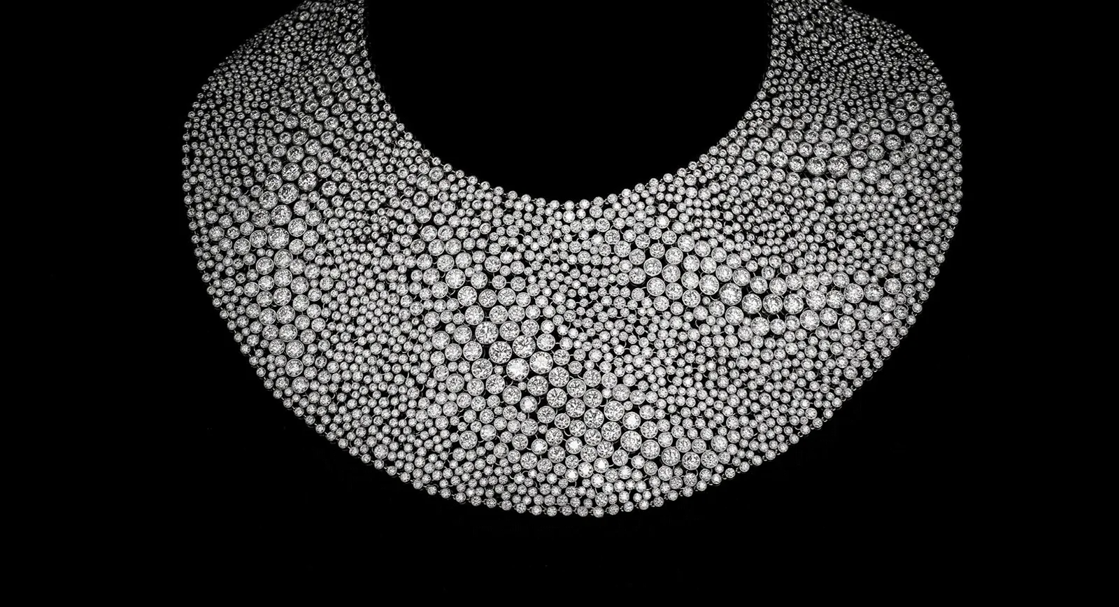 The collection’s colour palette is also in a state of perpetual transformation and transfiguration: a monochrome bib necklace with over 3000 stones, a cuff bracelet, a necklace and a ring made from the purest white diamonds give way to a fantastical ring, pendant, bracelet and earrings made from the same stones together with yellow diamonds. However, this is not the last of the alterations since the collection is bursting with succulent, bright and passionate gem stones on rings and on brooches including pink spinels, blue and yellow sapphires, neon Paraiba and green tourmalines.
