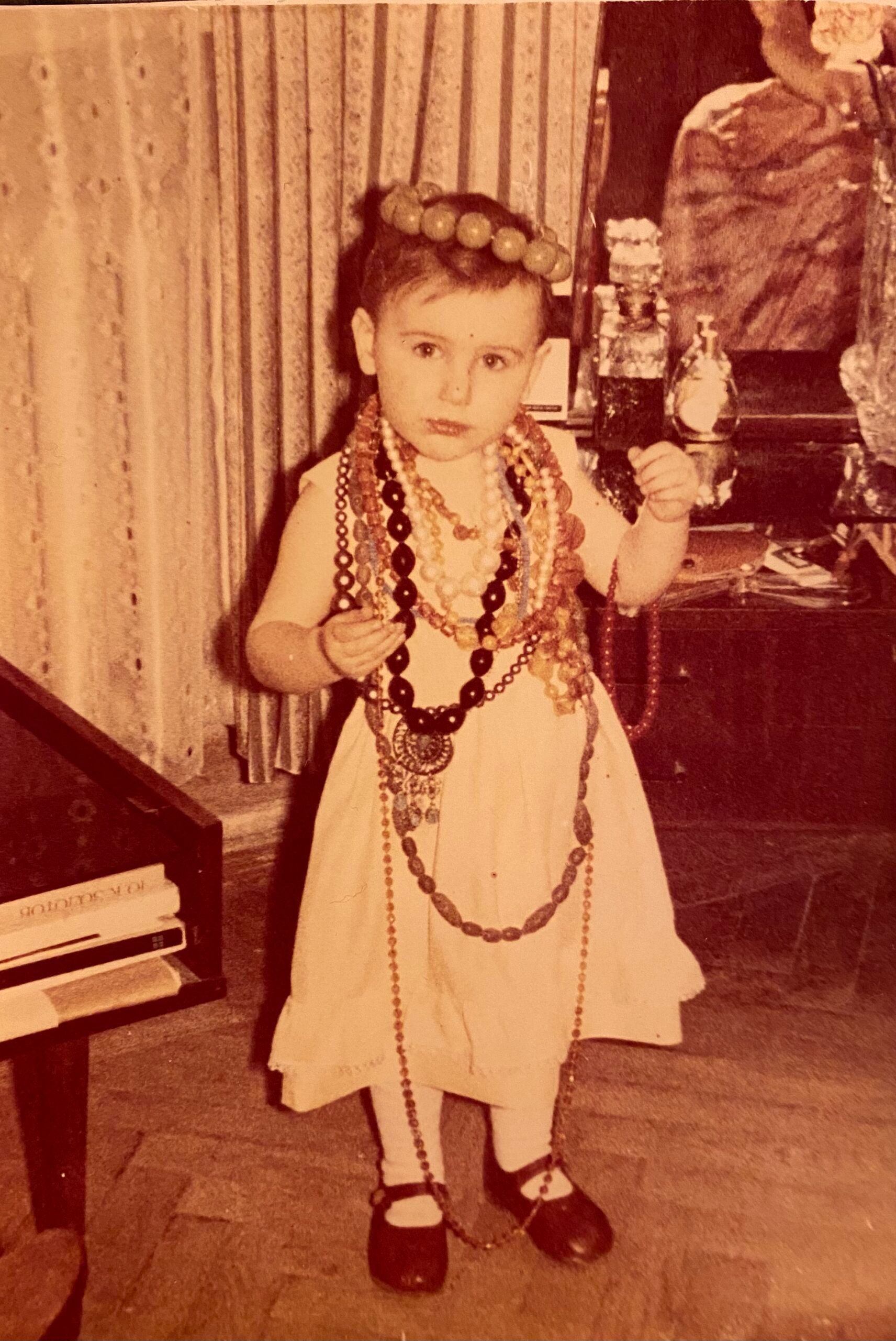 Katerina Perez as a small child playing dress-up with the pieces in her grandmother's jewellery box