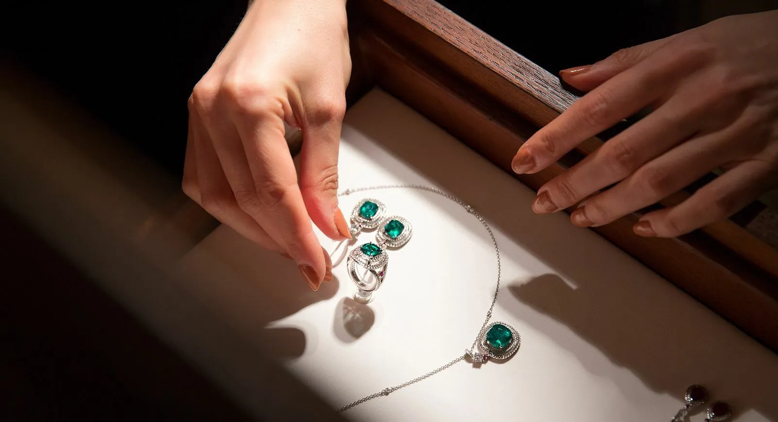 Gübelin ‘Glowing Ember’ pendant necklace with Colombian 4.61ct emerald, ring with Colombian 2.46 ct emerald and earrings with Colombian 2.35ct and 2.14ct emeralds, all with diamonds and accent rubies