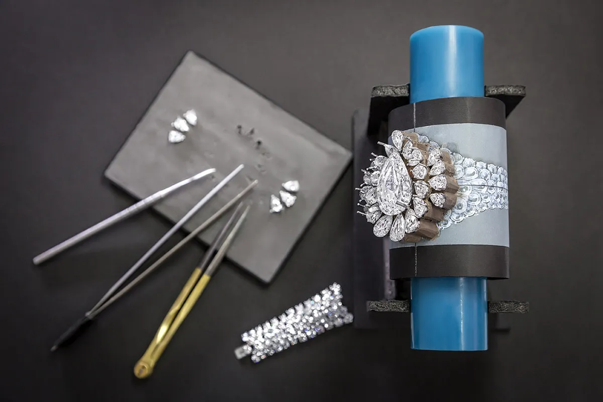 The timepiece has an interchangeable pear shape diamond that can be worn as the centrepiece of a highly sculptural bracelet or placed into a bespoke shank and worn as a ring. The jewel can be transformed into an opulent jewelled timepiece by cleverly inserting an elegant diamond watch face into the bracelet. Founder and Chairman of Graff Diamonds, Laurence Graff, has played a key role in the design and meticulous creation of The Fascination, which stemmed from a thought-provoking and masterful collaboration between the jewellery house’s London and Swiss ateliers.