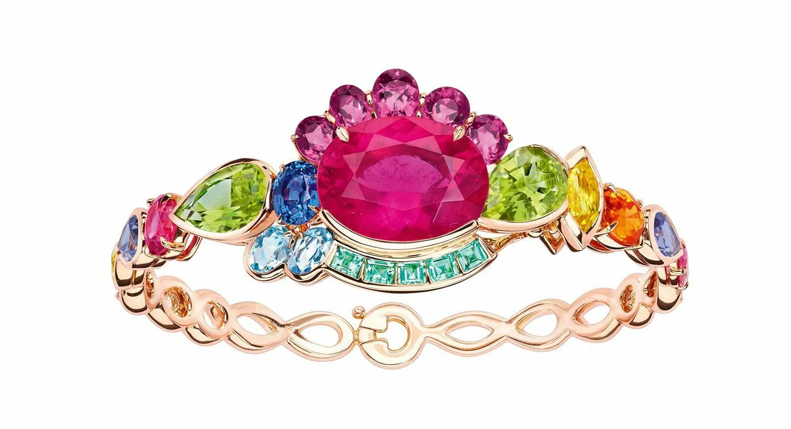 Among them is a watch with a dial made of turquoise and a pink gold bezel, decorated with round-cut yellow sapphires. The watch is complimented with a pink strap and a buckle, also made of pink gold and adorned with diamonds. These works echo the festive, carnival atmosphere of the Granville – a sort of childhood companion to the couturier – especially when he fashioned clothing for himself and his friends.