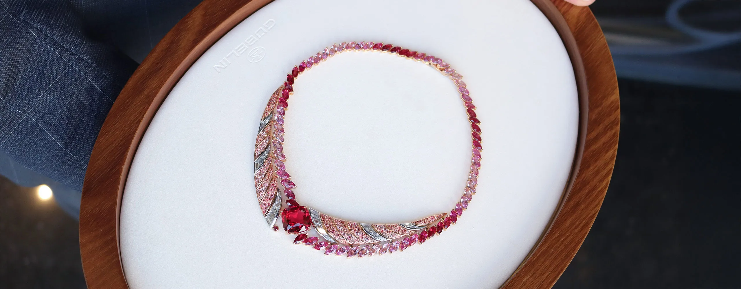 The Tanzanian Sunrise High Jewellery necklace really capitalises upon the gradients of colour available in the spinel mineral family. The piece centres around a 22-carat cushion-shaped red spinel from Tanzania, which first captured the attention of Gübelin’s designers thanks to its unusual internal landscape (visible only with a microscope), which reminded them of “a dragonfly spreading its wings at sunrise and taking flight”.