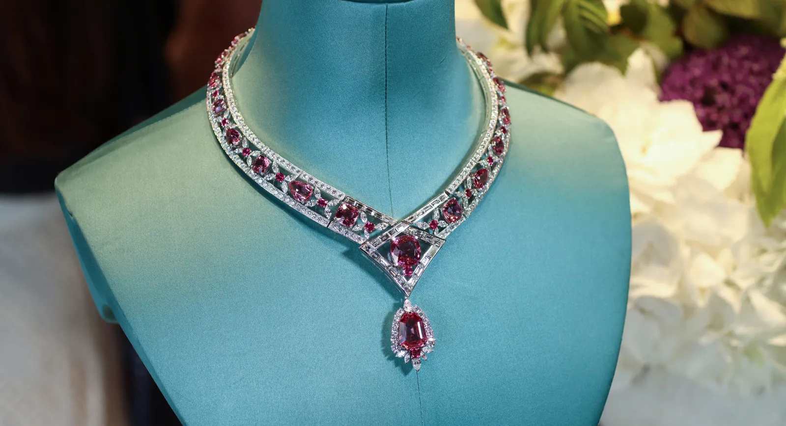 Gucci Labirinti necklaces left to right: necklace with a 25.88 – carat heart-shaped rubellite, a 4.01 – carat heart shape diamond, rubellites, white and fancy diamonds in white gold, and a necklace with a 45.68 – carat mandarin garnet, Paraiba tourmalines, white and fancy diamonds in white gold