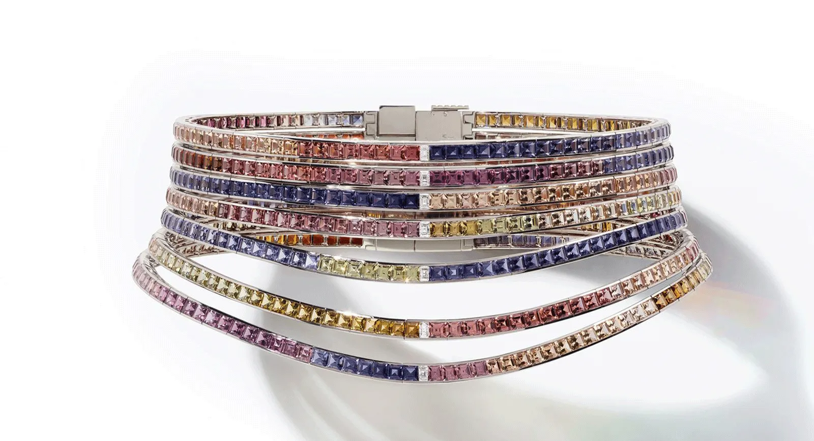 The Fire in the Sky (Feux de Ciel) choker, cuff bracelet and ring are evocative of the multi-coloured scarf collection of the same name, painted in bright colours: red, violet, blue, light blue and others. And Pierre Hardy has illuminated the jewellery he created with gems of the same shade: green and pink tourmalines, wine-red garnets, violet iolites, orange-pink imperial topazes and diamonds. The succulent tones smoothly flow into one another from stone to stone of the same “princess” cut. The gems are fixed side by side between gold rails put together in several rows one above the other which creates the volume that is characteristic of the jewellery’s showy effect.