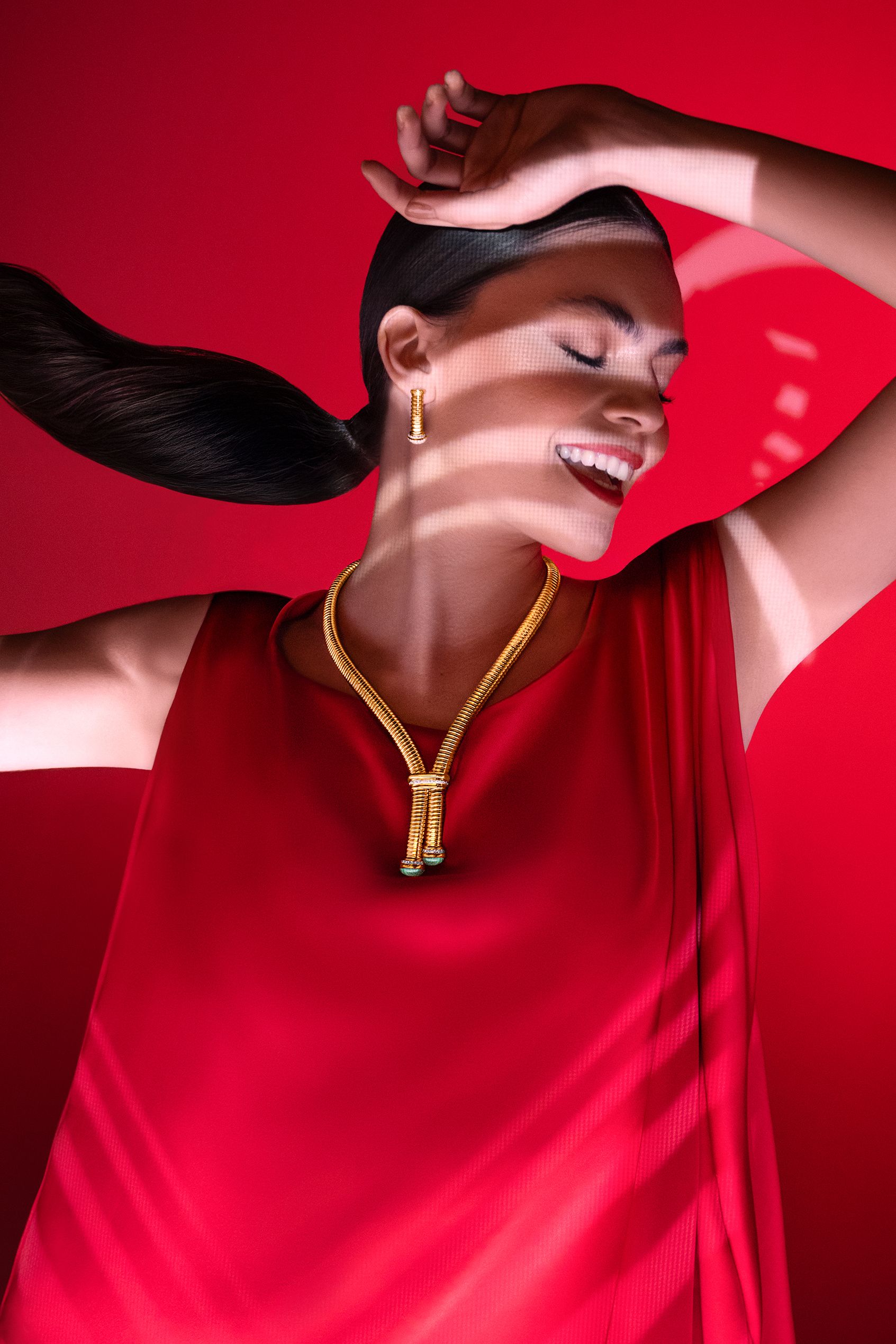Inspired by a more natural aesthetic, a model wears the Tourbillon collection choker and a more delicate necklace, both in 18k yellow gold with diamond accents