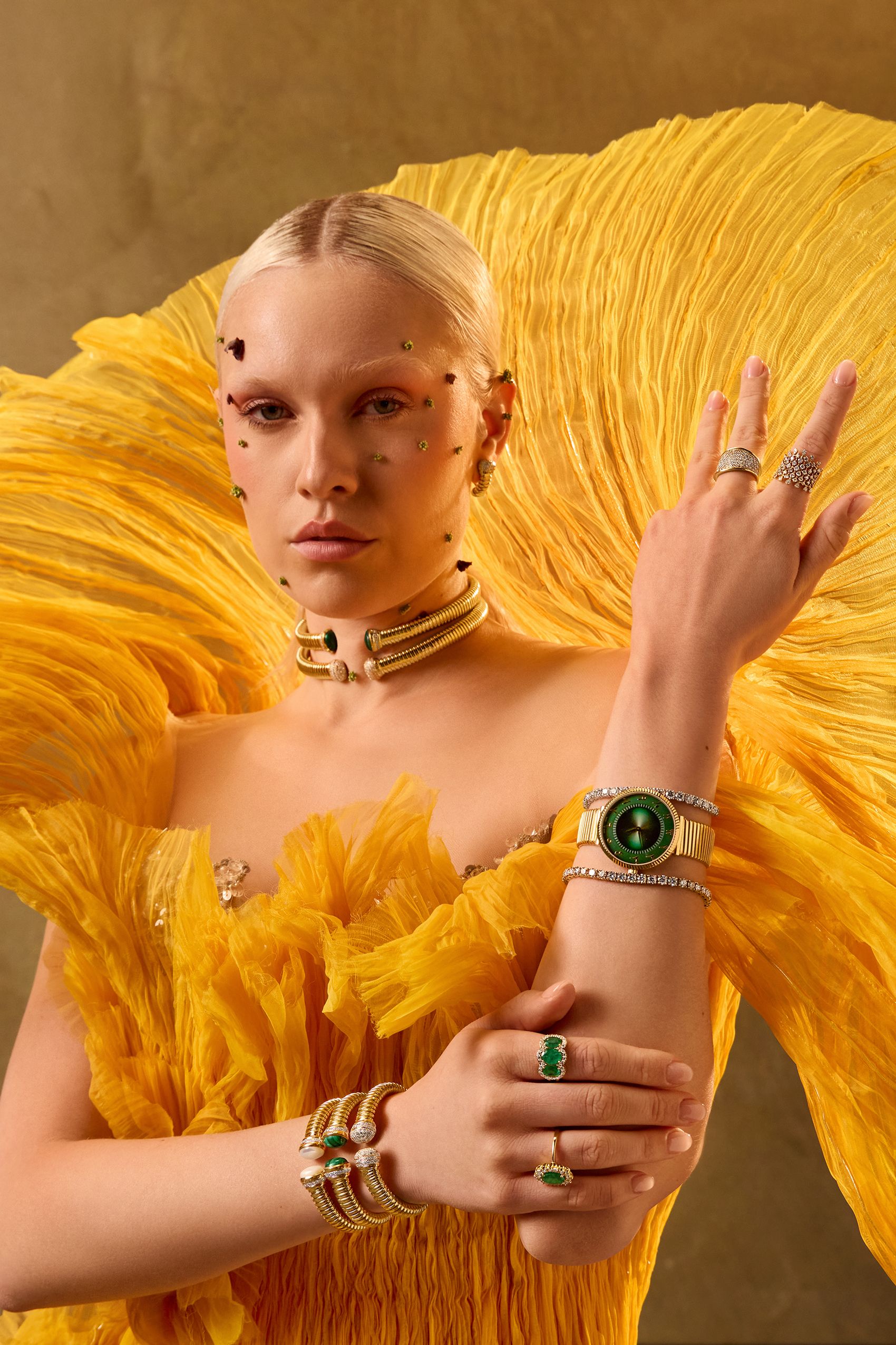 A model spotlights how the HIMO Jewellery Tourbillon collection can be styled in unconventional ways alongside tennis bracelets, cluster-style rings and watches