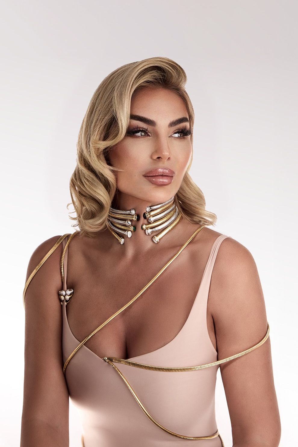 A model wears layered choker necklaces from the HIMO Jewellery Tourbillon collection