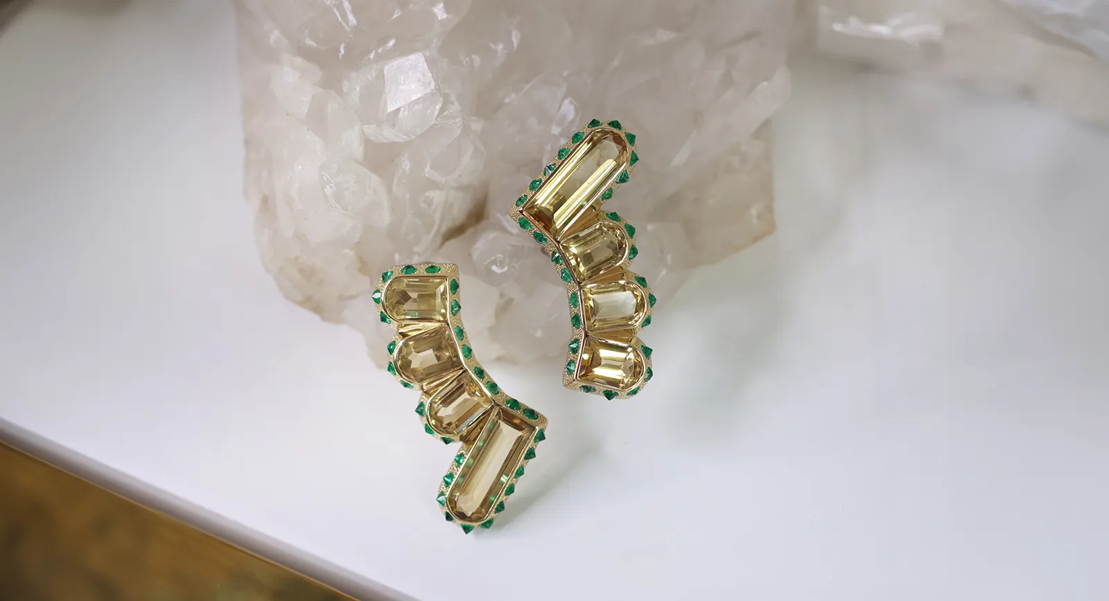 Finding an affinity with coloured stones is only a small part of Hugo’s process, though. His website states that “the most profound part of his craft is the moment of conception – the fusion of imagination and artistry that sets his creative journey in motion”. I think we can definitely see this out-of-the-box thinking in the Renaissance collection, especially in the Hyperborea earrings with citrines and emeralds and the Equinox Auriga earrings with ultra-thin slices of baguette-cut emeralds set in waves of 18k gold. It is not easy to come up with entirely original forms for age-old jewels, yet I don’t think I have ever seen shapes quite like these.