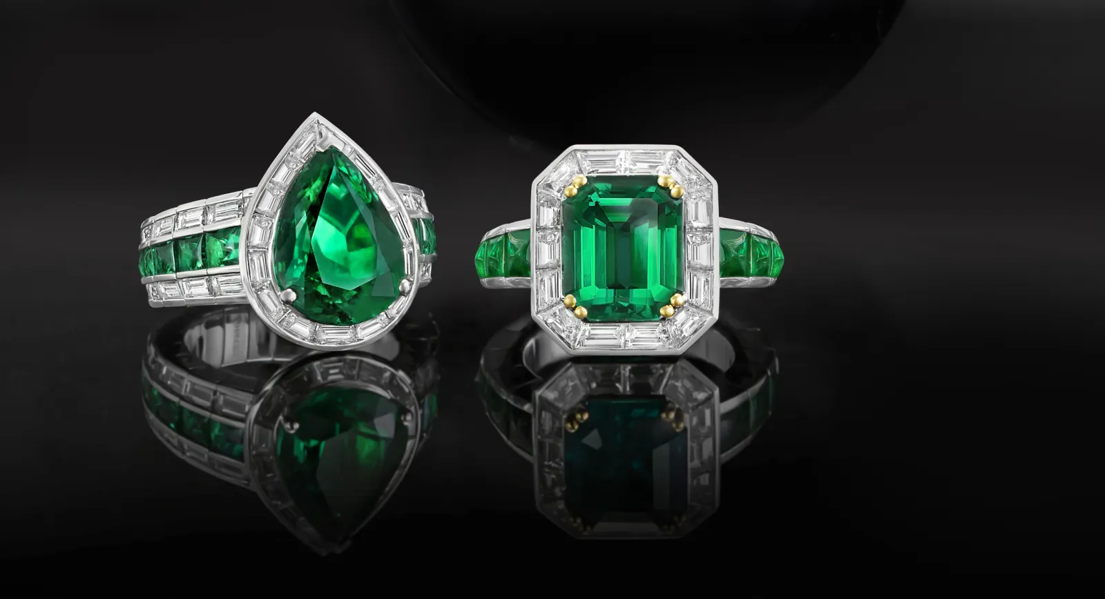A trio of Picchiotti rings set with (from left to right) a 6.11 carat pear-shaped Zambian emerald, a natural fancy yellow radiant-cut diamond of 7.13 carats, and a 5.41 carat octagonal Colombian emerald