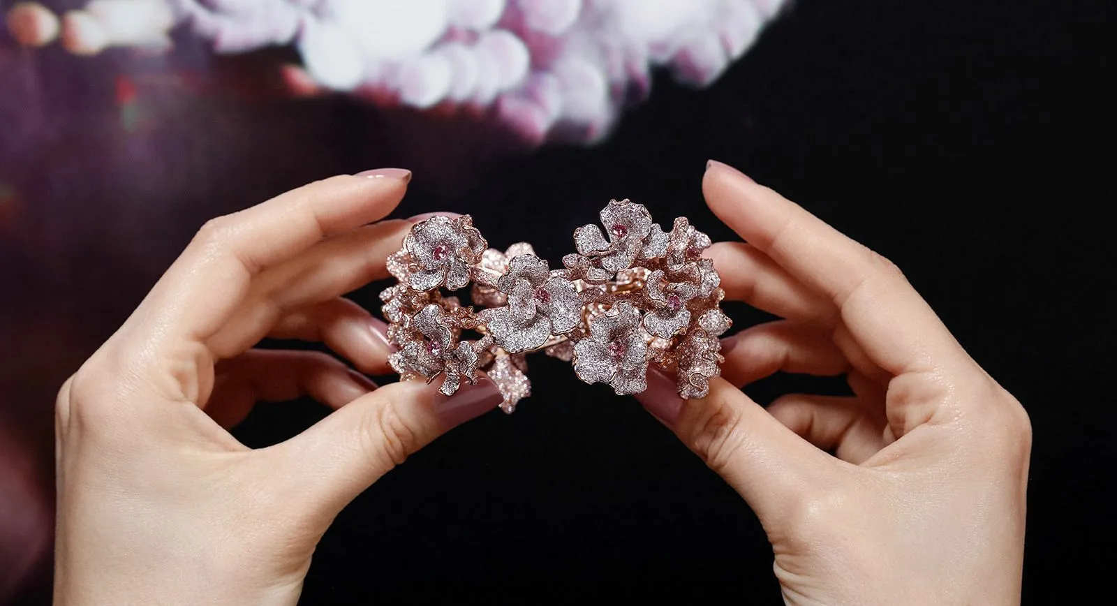 The Italian House Dolce & Gabbana, better known for its bright and extravagant fashion designs, will present a jewellery collection for the first time at the ‘In Bloom’ exhibition. Another debutant is the French designer Tatiana Verstraeten, who has released her first collection of high art jewellery. Her ‘Vienne’ necklace adopts an abstract flower petal form, resembling butterfly wings. The piece is made from white gold, along with thousands of diamonds, moon stones and enamel.