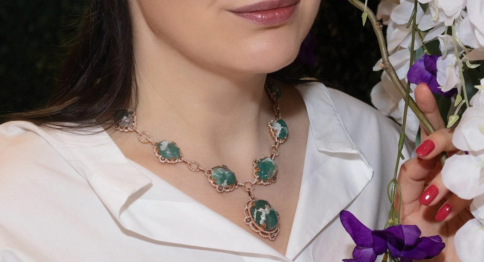 Aquaprase chalcedony was discovered by Yianni Melas relatively recently, and ‘Peacock Aquaprase’ is a natural blue-green variety with a mottled finish. Le Vian is using the gem to make a statement in a new series of jewellery, including this necklace set with large cabochons in a framework of diamonds, set in rose gold.