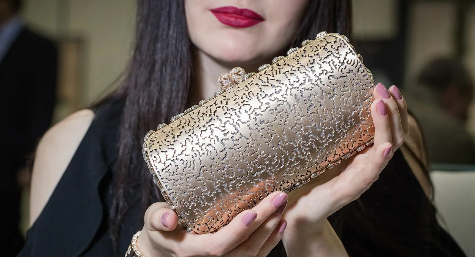 Since 1919, Buccellati has been offering its customers not only jewellery and watches but also a wide range of cutlery, figurines, dinnerware, cigarette cases, keyrings, souvenirs and, of course, evening bags. In developing them, Mario Buccellati, who founded the Italian jewellery house in 1919, wanted to highlight the close ties between Buccellati and La Scala opera house in Milan, which was located next to the first Buccellati store. Of all the designs, my favourites are the two clutches by Gianmaria Buccellati created in 1980 and 2008, which perfectly reflect the brand’s signature materials and techniques. The first is crafted from rigato-engraved silver and embellished with gold-engraved flowers and leaves, with the clasp encrusted with 44 emeralds (0.97 carats), 17 rubies (0.69 carats) and 28 diamonds (0.63 carats). The second, in engraved silver, features delicate lace edging and a rose and yellow gold clasp set with a 3.77 carat turquoise. Both real masterpieces made by true Italian masters.