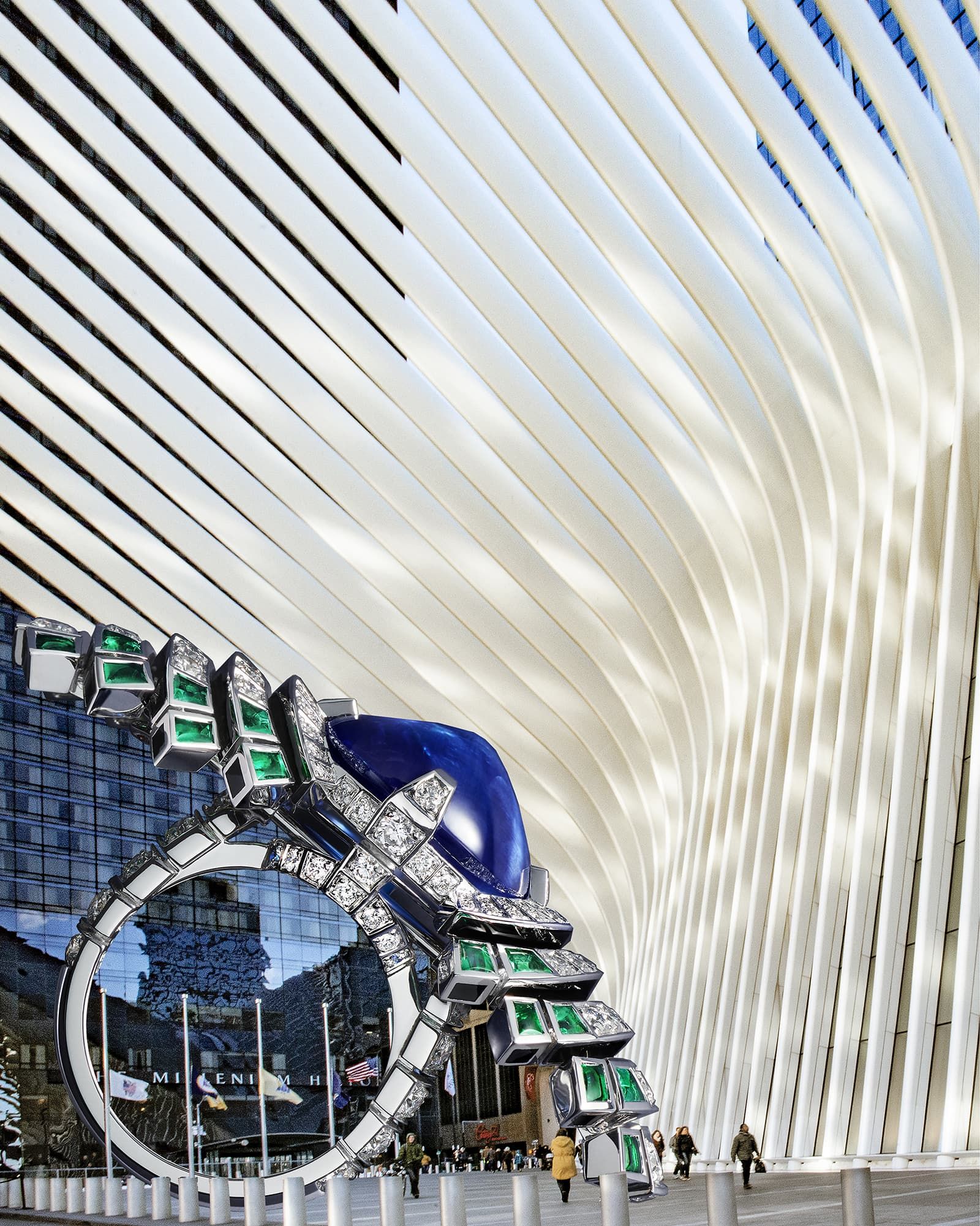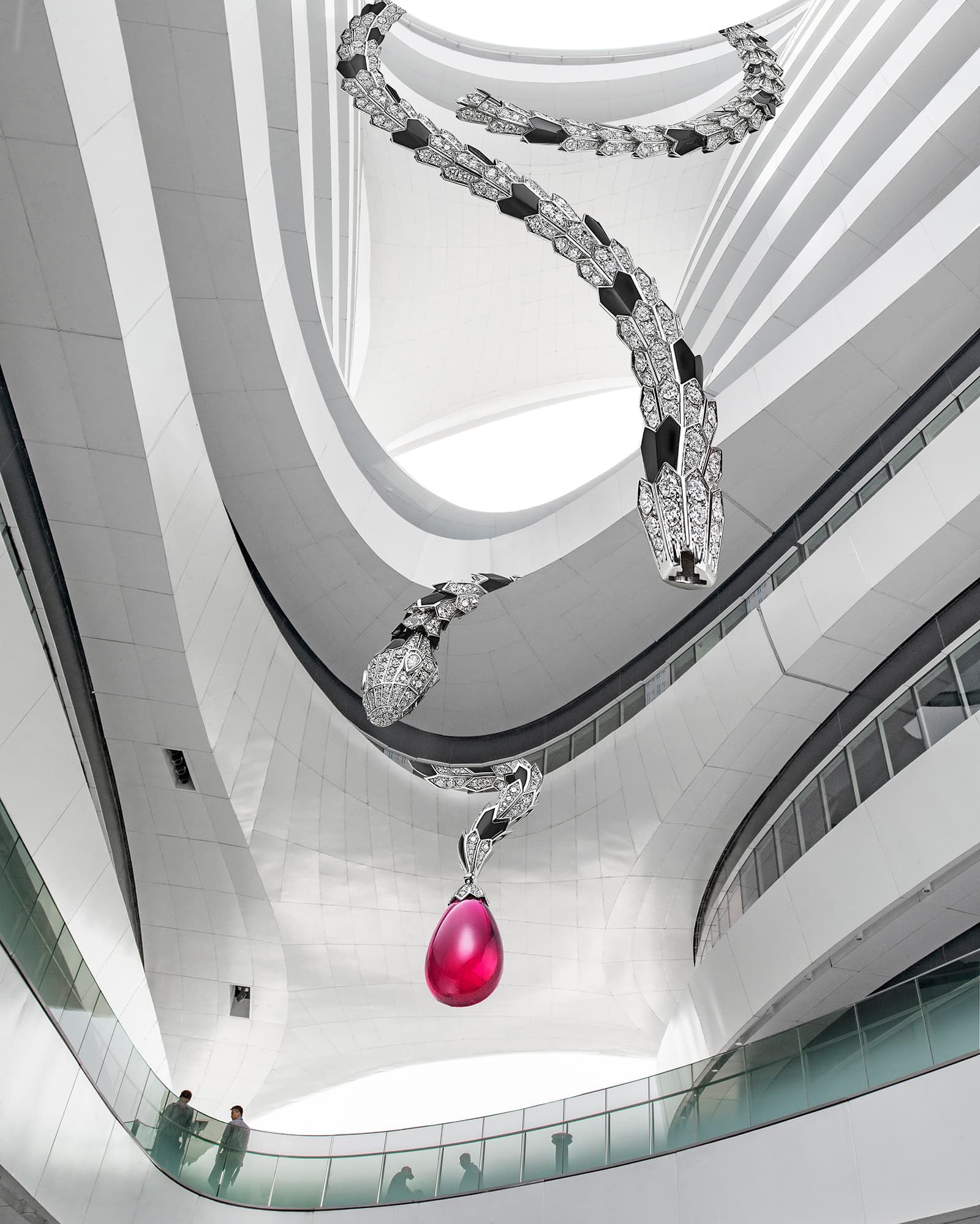 The curves of a building blend with a Bulgari Serpenti high jewel in this ‘archellery’ artwork by Veronica Morales Angulo