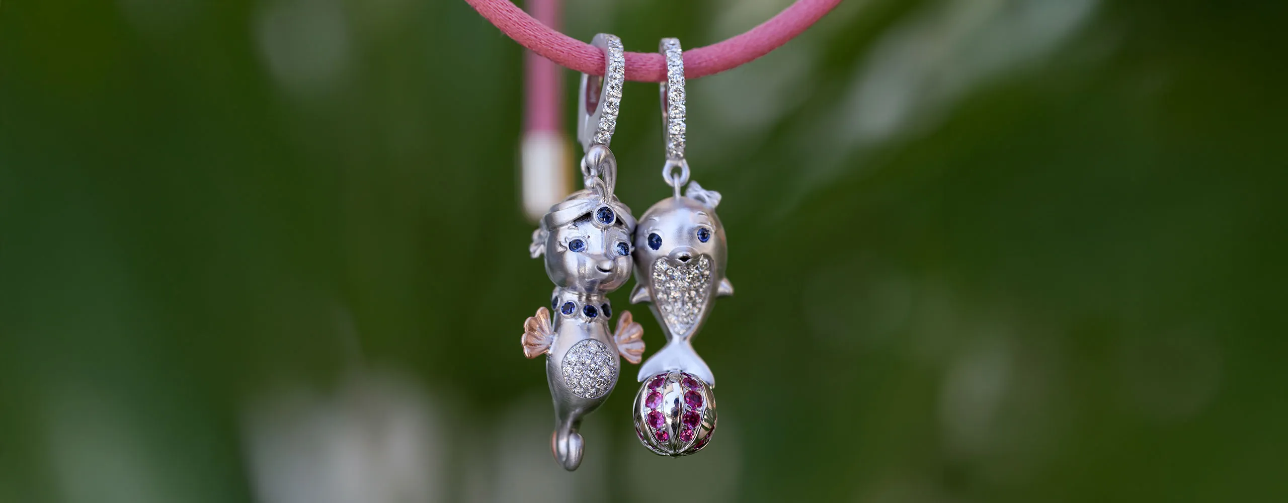 My highlights include the full pavé version of the Lantern Fish charm, with diamonds, rubies and sapphires in 18k yellow gold, as well as the 3D sculptural Dolphin charm, also with diamonds, rubies and sapphires in 18k gold. I also like the Outline Jellyfish charm, with sapphire cabochon juggling balls and an openwork, diamond-set jellyfish set in 18k rose gold. What I most admire is that each character has a back story: the seahorse is a girl, whereas the turtle is a boy. "The lantern fish is the star of the show," Karina tells me, "because he's not the most beautiful fish in the ocean with his big teeth; he looks scary, and I thought sometimes people judge a book by its cover." Elsewhere, the turtle is athletic, although he doesn't have the music or dancing skills like other characters, while the seahorse is beautiful, elegant and chic (which you can see in her fluttery precious metal eyelashes)