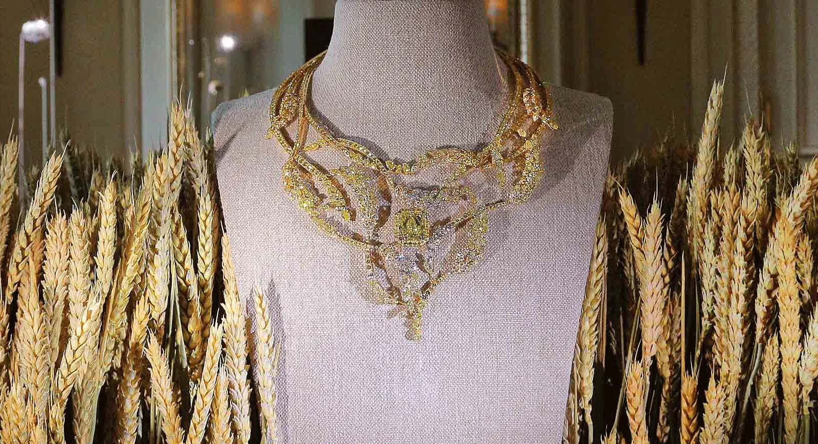 The new collection includes 62 unique pieces in the palette of warm colours of nature typical for the end of August. To create these jewelled treasures, craftsmen made use of platinum, white and yellow gold and of course a special role was played by gemstones of yellow and green hue. For example, in the Fête des Moissons necklace the sunny glow of the central rectangular diamond is echoed in the gleam of the 121 fancy-coloured diamonds weighing a total of 46.7 carats, the 932 bright-yellow diamonds weighing 40.4 carats and the 165 colourless diamonds. The centrepiece of the Moisson d’Or necklace is a yellow 16.8 carat sapphire, which is surrounded by diamonds and 977 sapphire beads with a total weight of 477.5 carats.