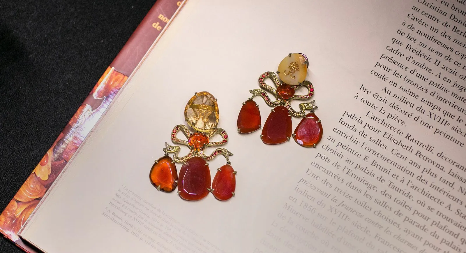 Titanium, along with yellow gold, forms the precious structure holding the gems. Since Lydia’s jewellery is notable for its scale, she ensures that her pieces are not only spectacular, but also comfortable to wear, so in recent years she began to turn to this light metal more often in order to ensure comfort. The asymmetric earrings found in the collection which are adorned with cupids are composed of yellow gold and titanium, and decorated with citrines, opals, sapphires, garnets and chalcedony, demonstrating her dedication to amber toned jewels in this collection. The cocktail ring in the shape of a casket and made of yellow gold and titanium with sapphires, chalcedony, red jasper, opal garnets and rubies is no less impressive in appearance – I should note at this point that each piece is inspired or even literally repeats the elements that exist in the Amber Room.