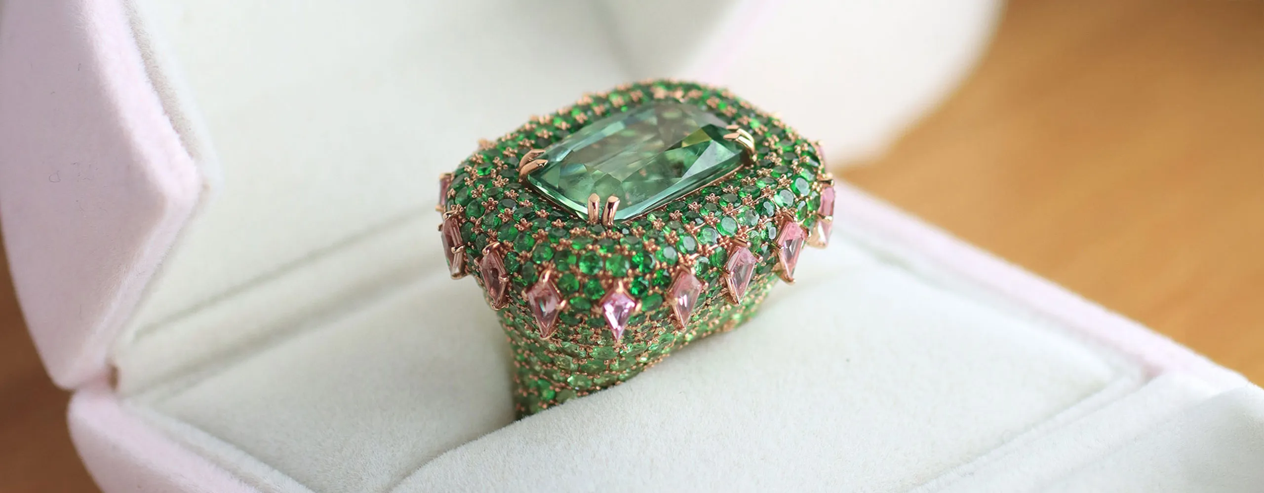 MB: My expertise in colour theory has been finely honed through my background in interior design, where the interplay of colours creates ambience and evokes emotions. This experience translates into my jewellery designs, where I explore the emotional resonance of colours and their ability to tell stories. For example, working with bi-colour tourmalines allows me to delve into a broad spectrum within a single stone, offering unique opportunities to create pieces that are not only striking but also emotionally compelling.