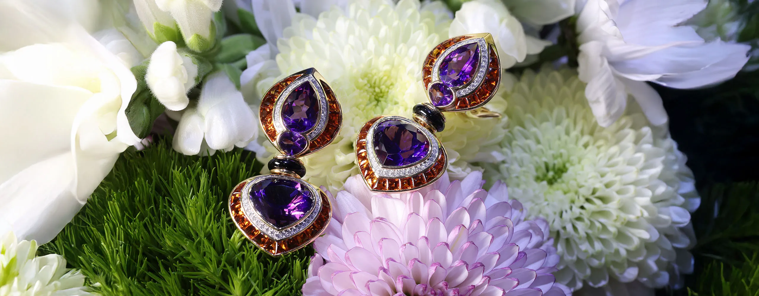 Marina B Papira high jewellery earrings, set with two heart shape rhodolites totalling 14.05ct, 3.63ct hexagonal amethysts and 1.20ct pink spinels in 18k yellow gold