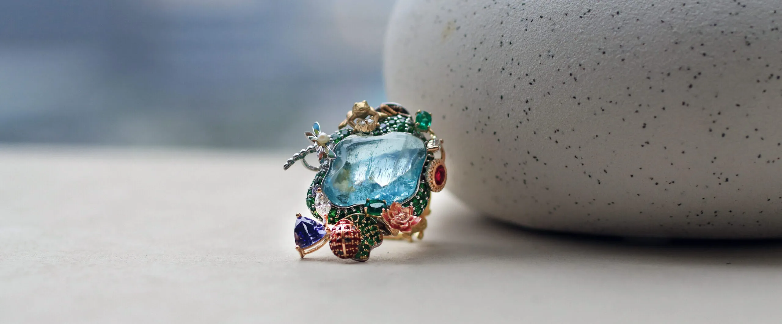 Nature is indeed a source of inspiration for the Mariyeh Ghelichkhani brand, although what I have noticed and found really interesting is that the designer is not constrained by realism. She’s content to put her own spin on flowers, for example, if it means achieving the most authentic interpretation of what’s in her mind’s eye. A beautiful showcase of this approach can be seen in a fantasy-cut tourmaline brooch, bursting with pearls, multi-coloured gemstones and diamonds in what could be interpreted as a tree or a bouquet of flowers. This piece is also indicative of Mariyeh’s ‘painting with gemstones’ style, including tonal mixes of minerals in abstract combinations. Opals, tourmalines, large pearls and freeform gemstones also appear in her works, including a large aquamarine ring inspired by the surface of a woodland pond. All her creations are united by incredible levels of detail, as well as cleverly constructed layers of colour, from soft pastel hues to sharper shades that draw the eye.