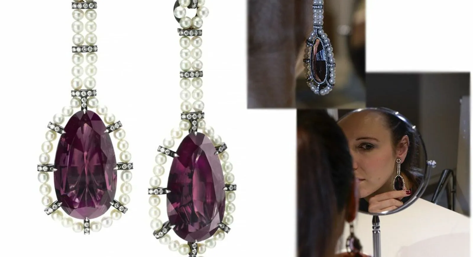Whilst scrutinising the exquisite diamond necklaces – a sautoir with emerald beads, rings with huge old-mine diamonds, clocks crafted with carved gemstones – I noticed two charming pieces that boasted spectacular gemstones. One of these was a pair of earrings with an impressive pair of pinkish purple spinels surrounded by a halo of pearls; the other, a ring whose shape resembled the Portuguese designs typical of the 18th century.