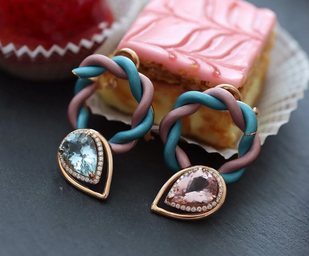 Katerina Perez wears the Mayiana Amour Pastel earrings (left) with a 3.09 carat pear-shaped morganite, a 2.96 carat pear-shaped aquamarine and diamonds set in 18k rose gold and pink and blue aluminium, shown here alongside the matching ring and bracelet