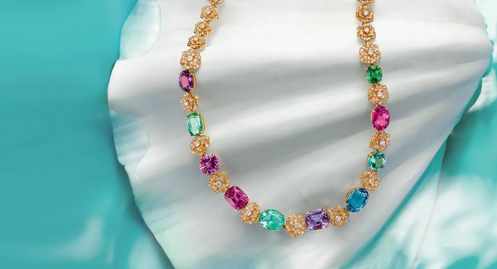 In the Mediterranean Garden collection you will also see jewellery with roses, which are the signature flowers of the brand. They represent Yves Piaget’s relentless passion for the Queen of Flowers. Also growing in this imaginary Mediterranean Garden are luxurious palm trees made from diamonds, emeralds and Paraiba tourmalines. These stones come together in harmony in a necklace and long earring set.