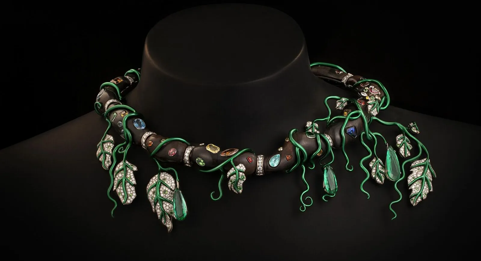 The pieces, with their subtle aesthetics, grace and tenderness, are imprinted with and mirror the grace and poetry of nature. The provocation of the world of Shakespeare’s play – a world where fairy tales and dreams are reality – allowed the Princess to push aside classical conceptions of jewellery. Her creative approach to jewellery form is reflected, for example, in the Phalène necklace with its colourless and black diamonds, sapphires, spinels and aquamarines. From the front, it appears to be made from a few intertwining threads of diamonds, but on the back one finds a magnificent pattern in the form of a butterfly unfurling its wings. Another example of this unconventional approach is the Toile d’Araignée choker with its huge spider. Its form is openwork weaving of white gold and diamonds, and in place of a traditional lock is a framed corset tightened with scarlet shoelaces.
