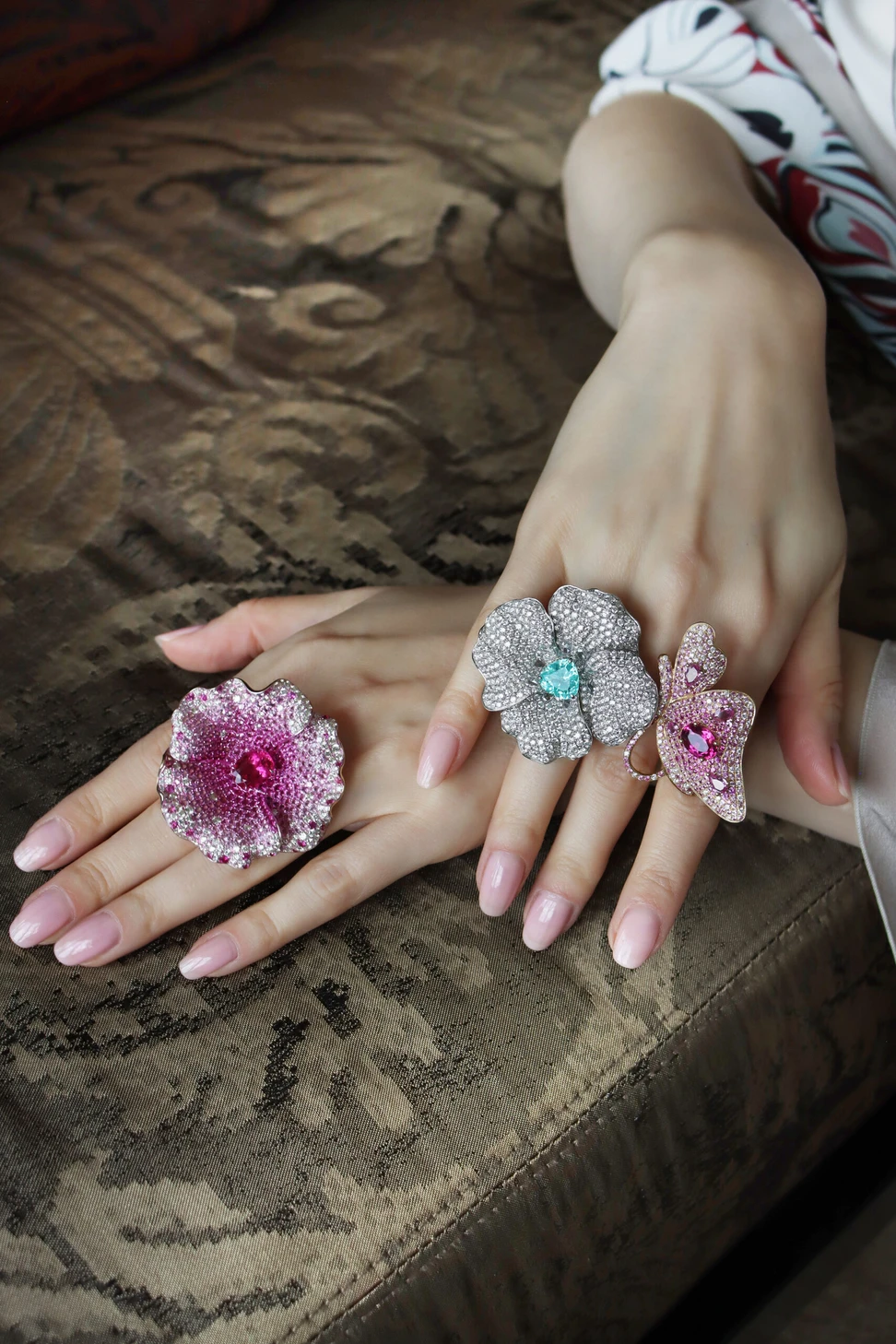 The designs she produces are whimsical and slightly magical but always with a mineral focus that is breathtakingly large and saturated. She explains: “I am drawn to Asia, especially the beauty, nature and architecture. But when I come to Europe, I never miss a museum or art exhibition. I believe I see so much more in both Eastern and Western culture because I can view both from the outside and the inside at the same time.” Flowers and butterflies are a core theme, which is especially evident in a remarkable multi-finger ring featuring a pink sapphire and diamond butterfly ‘landing’ on a diamond-set flower with a soft, triangular Paraiba at its heart. “I used to spend a lot of time in gardens in Kyoto and that was my favourite time to get inspired,” Narcisa explains. “Just being quiet and meditating allows me to see everything.”