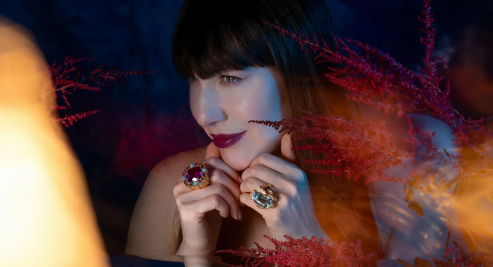 Join me in a woodland landscape where nothing is quite as it seems! In this latest editorial photoshoot, created in collaboration with my friend and photographer, Ksenia Usacheva, we draw inspiration from fantasy novels, statement florals and Blade Runner-style neon colourways to develop our own high jewellery adventure. And let’s not forget the stars of this creative show: a series of sensational and very statement cocktail rings. Let’s turn the page on this epic together…