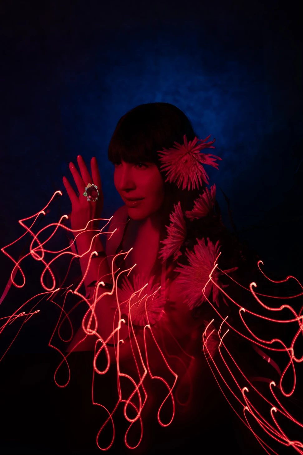 Florals, fantasy and neon lights aren’t necessarily three things that naturally intertwine, but I think the results of my recent photoshoot with Ksenia Usacheva speak for themselves. My idea was to view cocktail rings through a creative lens, including unusual reflections, lighting effects, strobes, shadows and lightning flashes to counteract the romanticism of flowers. What do you think? Have we succeeded in putting diamond and gem-set rings into a fresh context? By the time this shoot came to a close, I was reminded of the ‘personality potential’ of cocktail rings. They’re big, outlandish, colourful, dynamic, and the perfect way to be expressive, depending on your mood. The pieces included here have their own unique energies that we really tried to tap into through the styling, accessories and editing of the photographs. Now, when I look at the finished shots, I see something that makes me feel powerful and feminine all at the same time. I would be interested to know what you see, my jewellery aficionados!