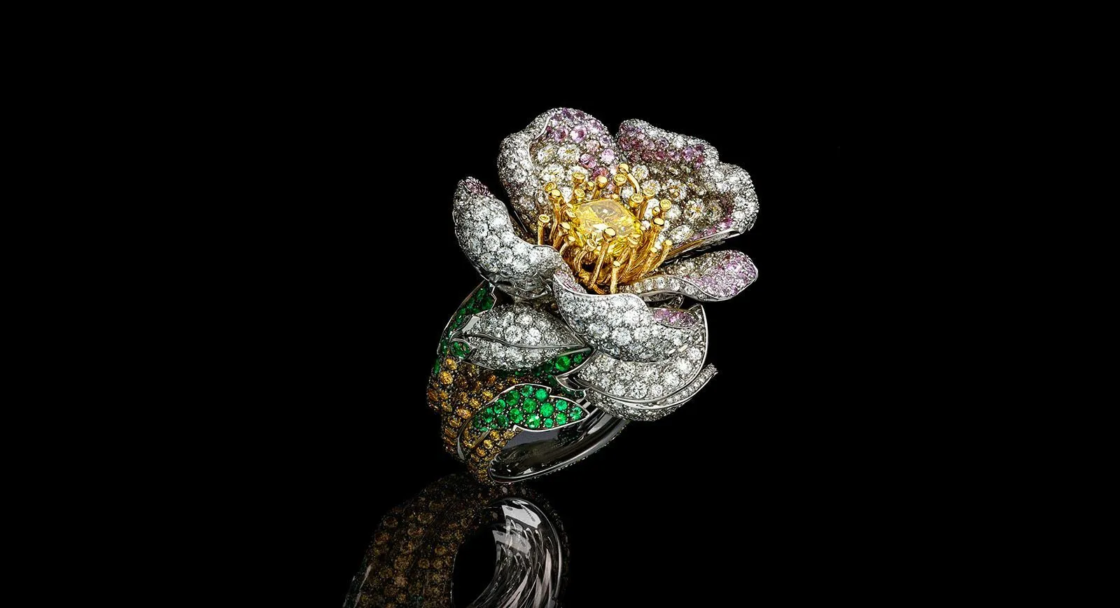In his designs, Giampiero Bodino examines the dichotomy between imagination and experience, between the reality and a dream, something clearly expressed in the Chimera diamond ring featuring a mythical beast. The Primavera ring, on the other hand, is not the fruit of fantasy; rather it is a perfect recreation of a blossom in jewellery form. A blooming bud from sapphires and white and yellow diamonds appears as alive and true to life as real apple blossom.