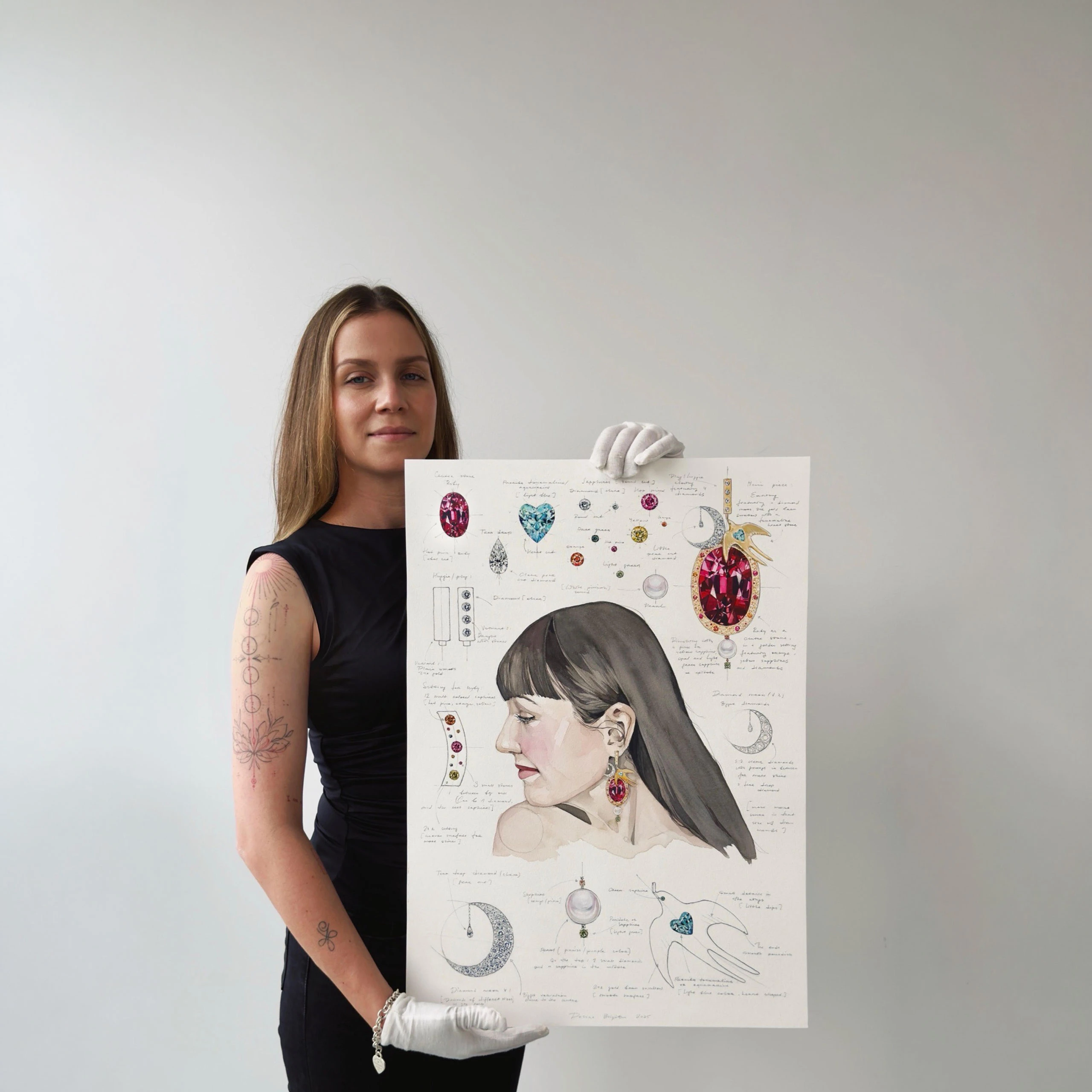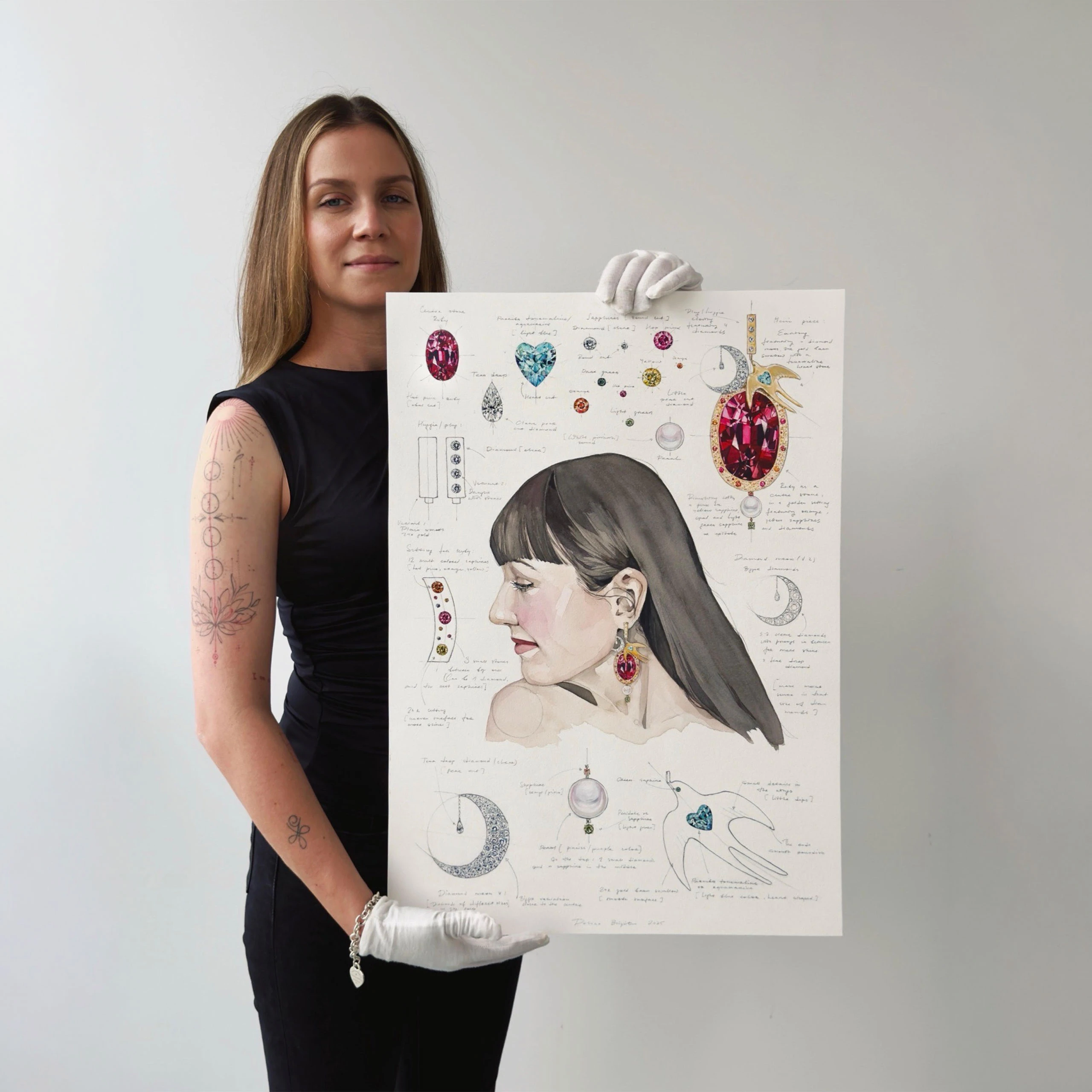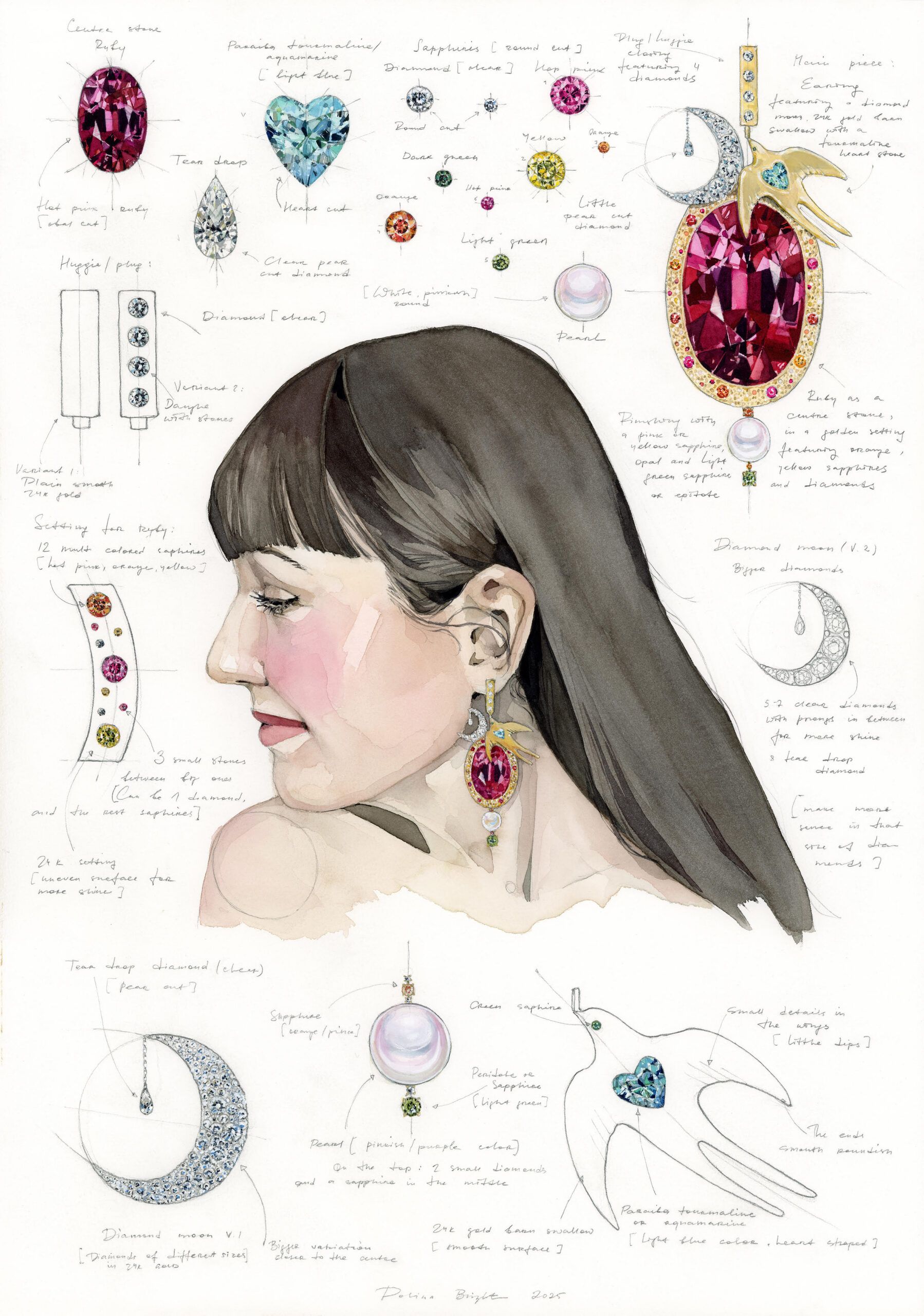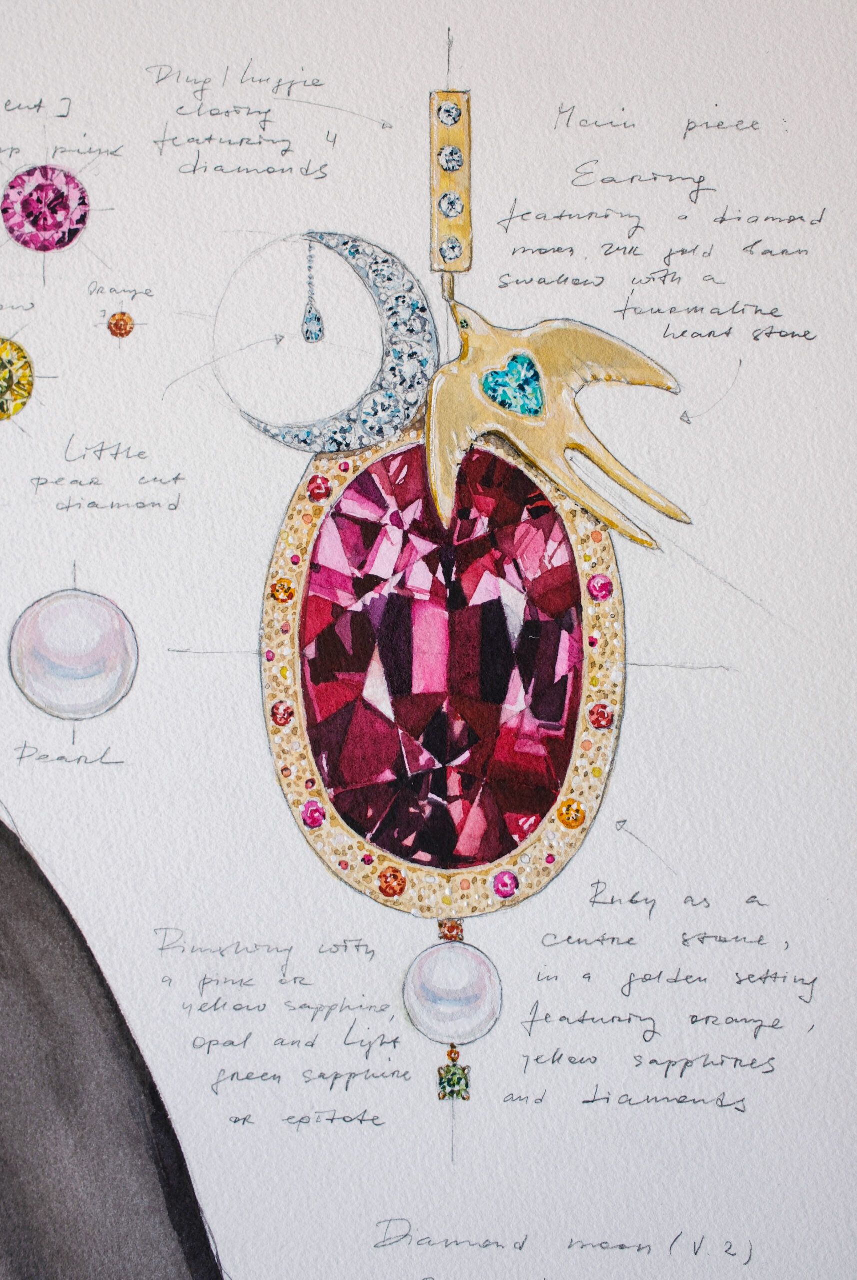 PB: I started by trying to capture the depth and light of the stones on paper, doing many sketches. For the portrait of you, I watched your videos to capture your true expression – not a posed one, but the thoughtful, genuine look you have when you’re just being yourself. The rest was intuition. I balanced the vibrant colours so they wouldn’t overpower, letting the ruby be the focal point. It felt like a natural flow.