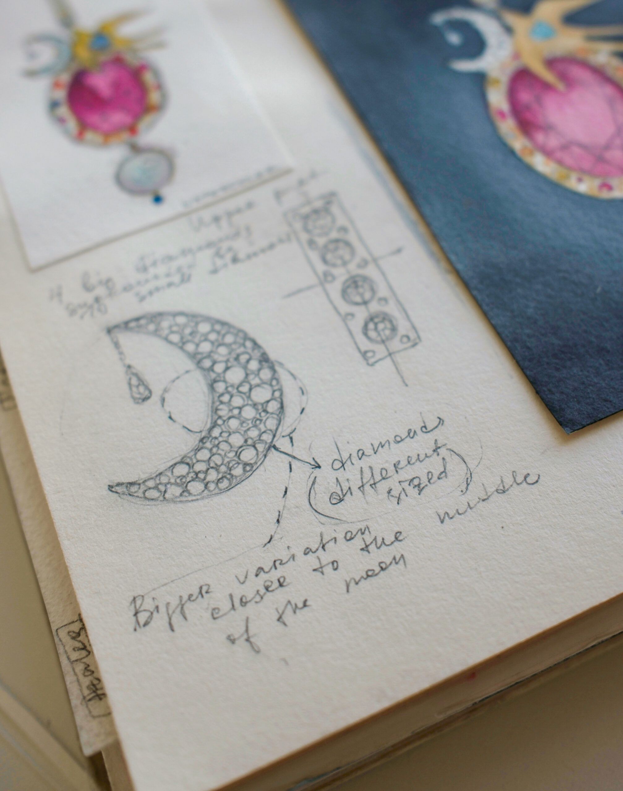 This diamond-set half moon detail forms part of an imaginary earring design envisioned by artist Polina Bright