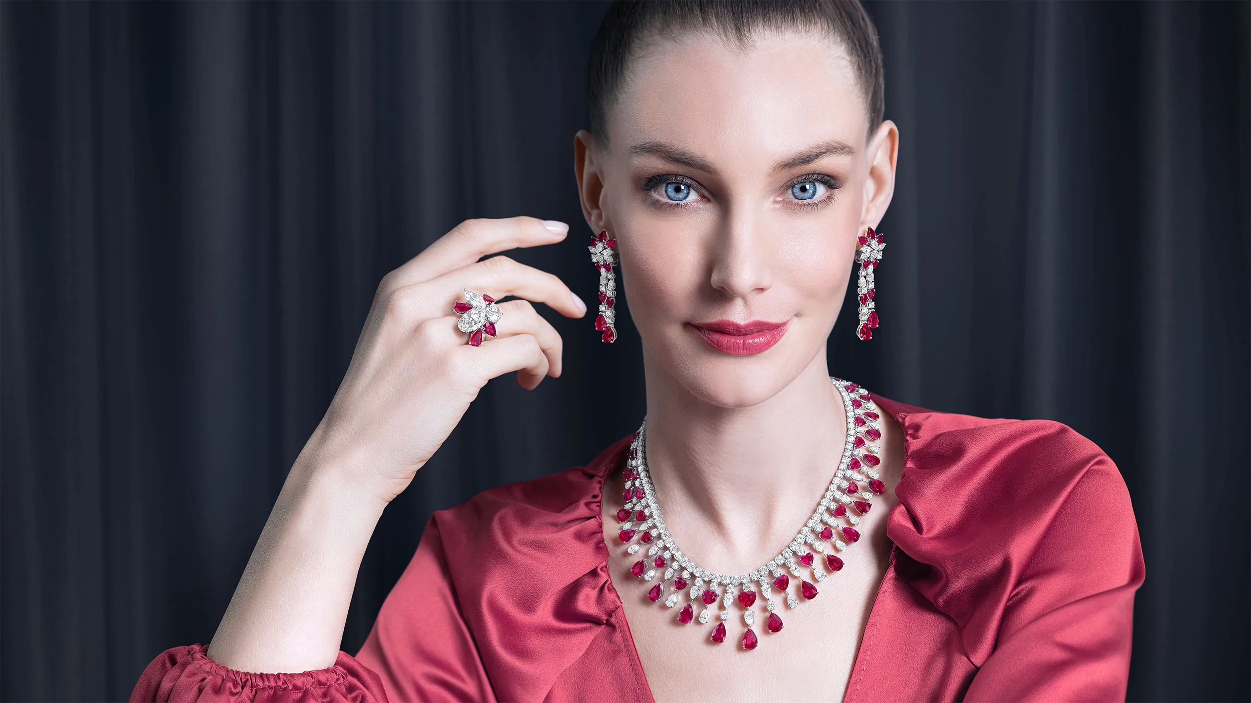 A model wears the Picchiotti Burma Super Star set from the Picchiotti Classics collection, including a pair of earrings with 2.01 carats of pear-shaped Burmese rubies, further Burnese rubies of nearly 14 carats, and pear-shaped, marquise-shaped and round brilliant-cut diamonds totalling 6.54 carats, all set in 18k white gold