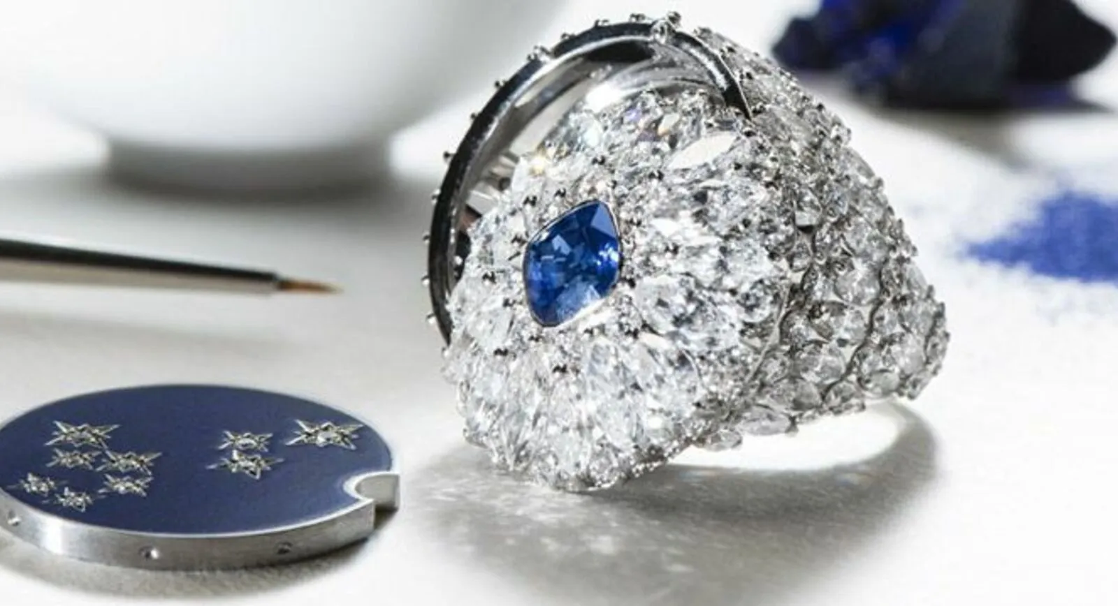 The second of the diamond rings hides a secret. The crown slides to the side to reveal a bewitching night sky created using grand feu and cloisonné enamel techniques. Thanks to the skilled work of the engraver, you can see the constellation Leo on the smooth, shiny surface of the enamel. The third ring, Palazzo, has a pattern formed from crosshatching of spinel and diamond which brings to life the elegance of Venetian art.