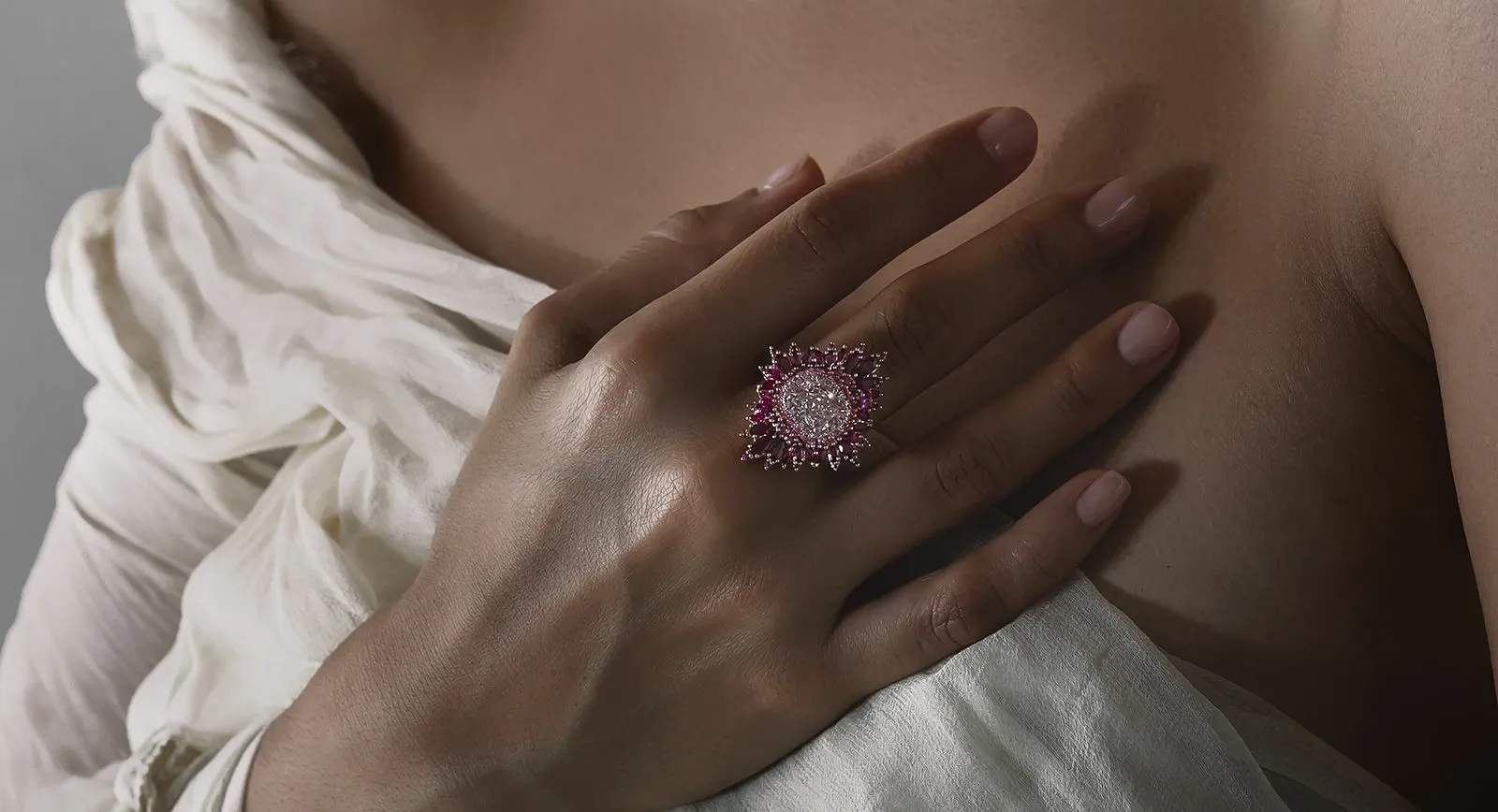Four pieces are heralded as highlights from the exhibition by Sotheby’s: the Cleopatra’s Vault pendant by Harwell Godfrey with Muzo emeralds, black and white onyx and diamonds in yellow gold; the Enchanted Garden earrings in rose gold and titanium with diamonds and rubies by Vanleles; the Almasika Universum bangle in 18k yellow gold with tsavorite; and the Rebel Black ring with a 5.01 carat pear-shaped diamond by Thelma West.