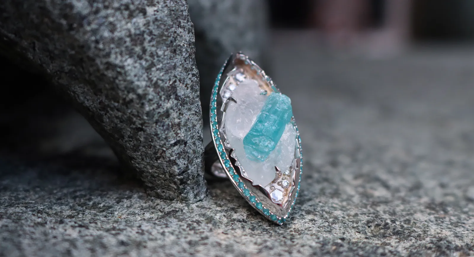 Susana Grau Batlle Evolution through Form ‘Form 1’ ring with a 19.05 carat Paraiba tourmaline in its quartz matrix, further Paraiba tourmalines, brilliant-cut diamonds and rose-cut diamonds set in 18k white gold and platinum, part of the A Trilogy of Evolution High Jewellery collection