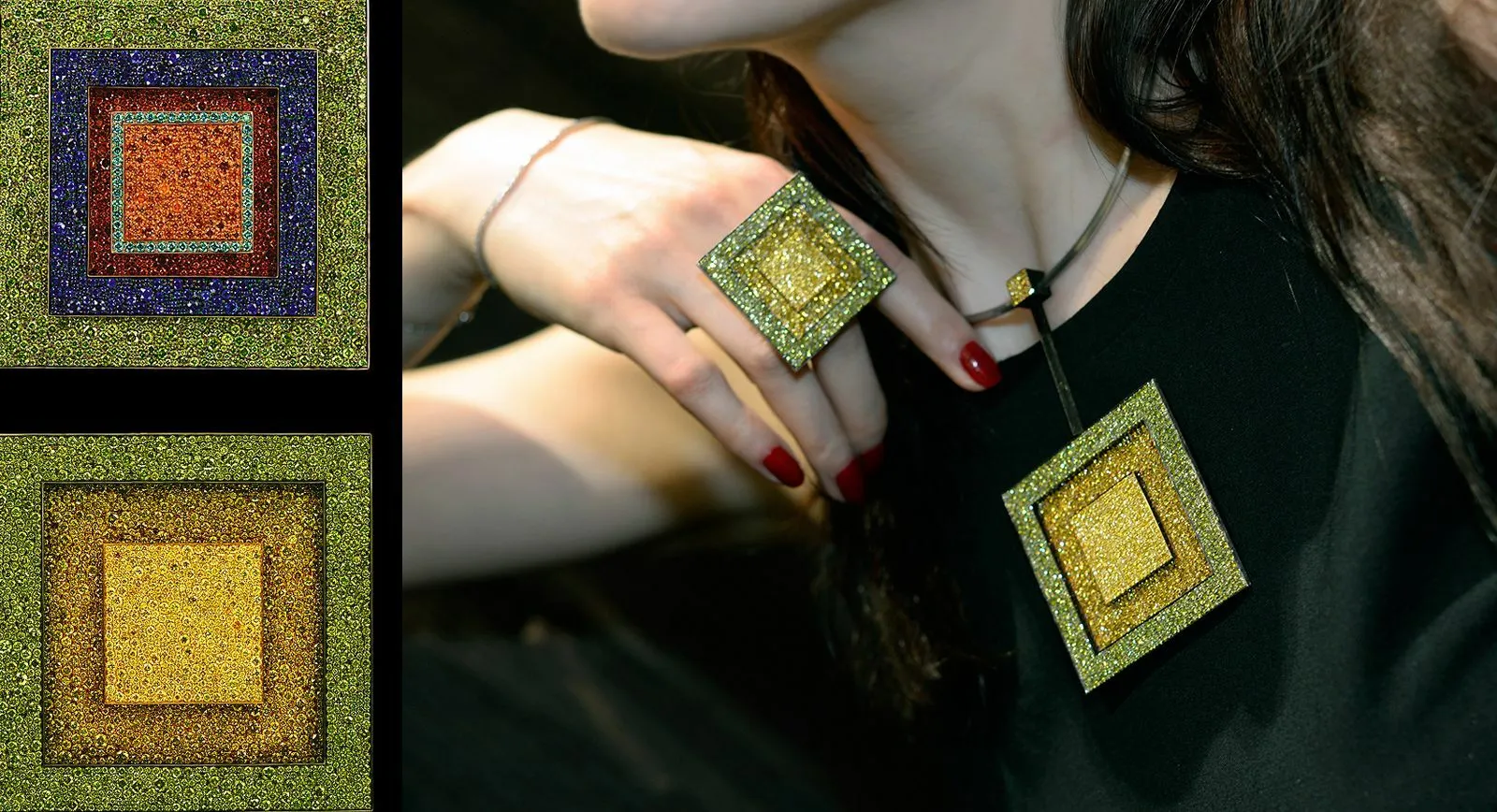 The designers have achieved this fascinating effect by the multi-layered construction of decorative elements or by laying them out on top of one another with overlapping corners. The latter is the trick they have used with their spiral design pendant, which is the piece in particular I want to draw your attention to. Inside the multi-coloured pendant there is same pattern as on the outside but reproduced in monochrome. This allows you to change your jewellery depending on your mood or your outfit simply by turning it over.