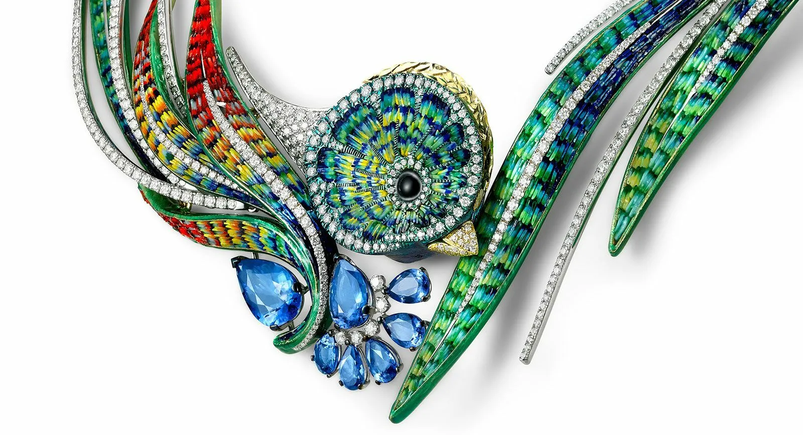When it came to achieving a lightweight look, the designers went for a winning combination of light, long and delicate decorative elements. So you have, for example, long tail quills made from multi-coloured micro mosaic particles, which create a smooth curve that follows the contours of the neck; or the half flower made from beautiful pear-cut tanzanites placed at the base of the necklace, offsetting the solid round head of the bird, the largest part of the necklace, and adding an airiness to the ensemble.