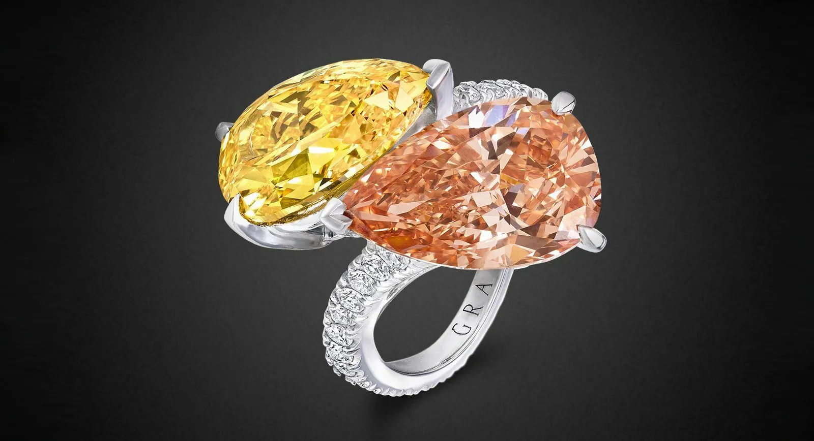 Rings, bracelets and earrings are the typical pieces to use this style; the earrings are usually asymmetrical, while the rings and bracelets feature two identically or similarly sized gemstones set opposite one another. So I do not talk about them all at once, in this article I am going to tell you a few facts about rings. The traditional design is a ring with two stones of the same or similar proportions either in matching colours, as you will get from Harry Winston, or different, as in William Goldberg’s ring with pink and yellow marquis-cut diamonds.