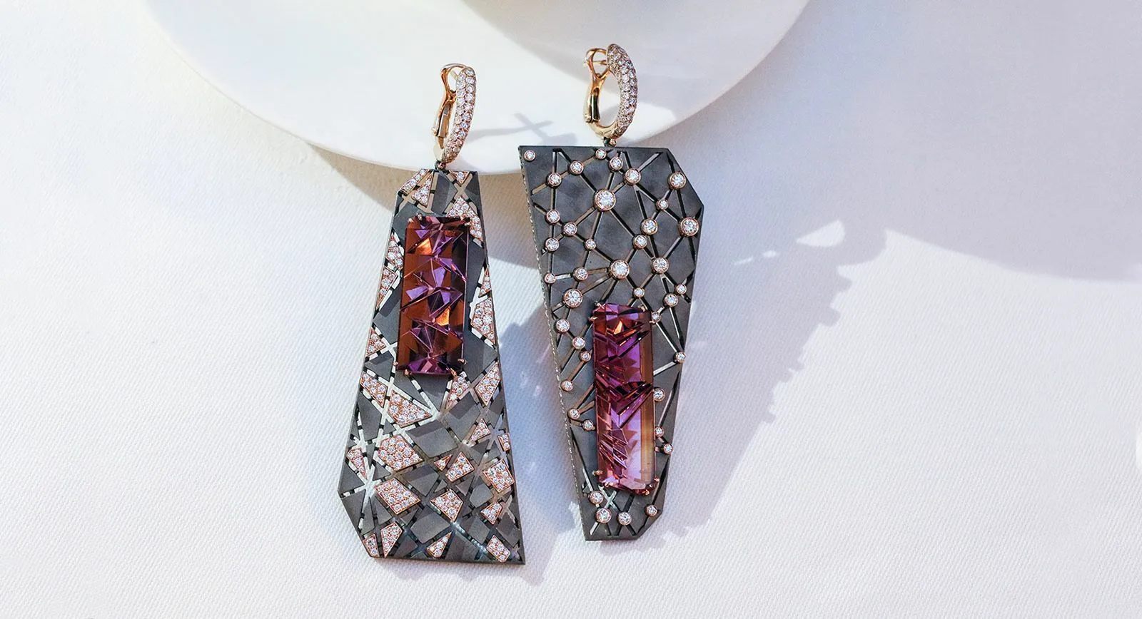 VMAR ‘Orion &Auriga’ earrings with fancy cut pink tourmalines of 17.50ct and 17.60ct, and diamonds in pink gold and titanium