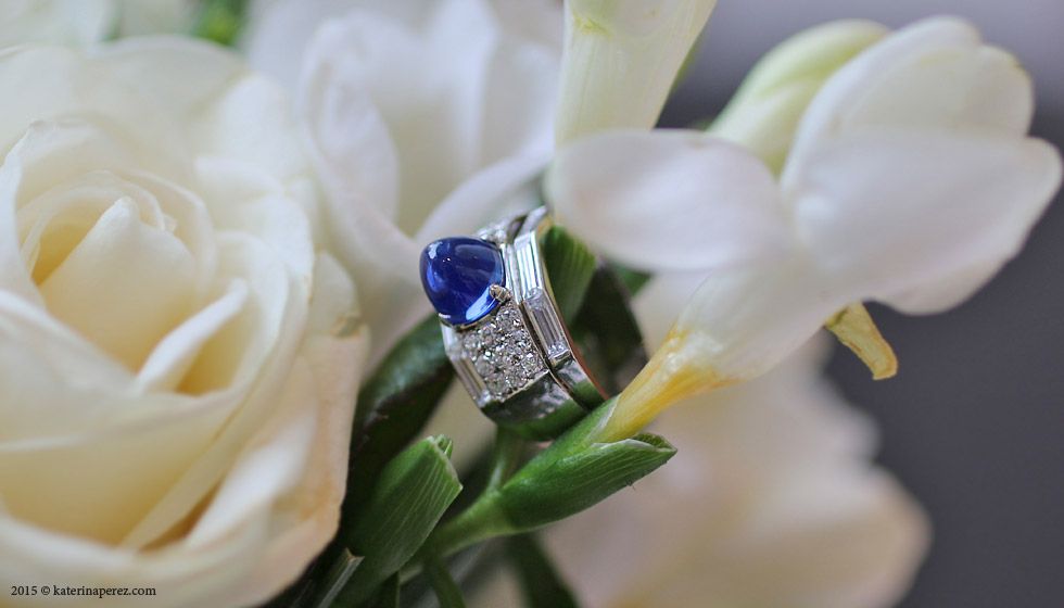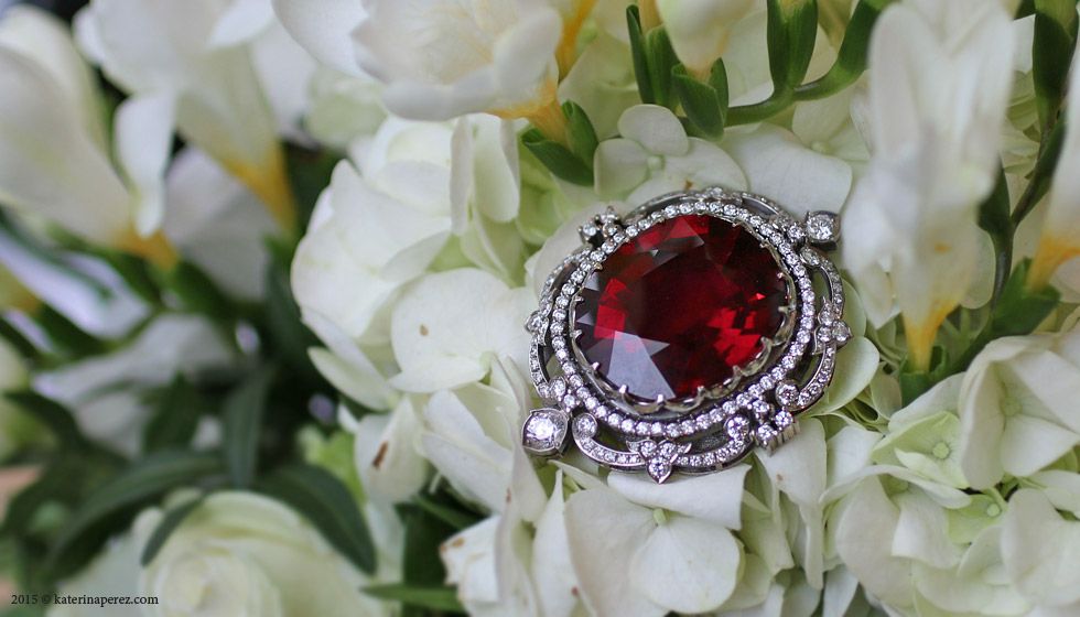The centre of the room was taken by a long table decorated with white roses that perfectly complemented jewels, watches and some unique precious items like gem-set compact by Cartier that will go on sale in just a few days. The entire centre of the table dazzled guests with the bright sparkle of precious gemstones: white and fancy colours of diamonds, sapphires, rubies and emeralds. They were diluted by the soft glow of natural sea pearls and a textured matt gold, which has become the signature of British jeweller Andrew Grima. Before the lunch commenced, Daniel Stryuf, Senior International Jewellery Director of Bonhams, made a presentation and spoke about the upcoming auction and trends. In his speech, he stressed that rare coloured gems jewellery had reached the peak of its popularity yet again and was once again in high demand. And with that I decided to focus on the key auction pieces that burst with colour. Here they are presented to your attention in the gallery below.
