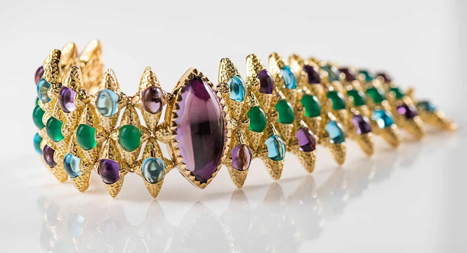 Katerina Perez: Unlike many other Qatari designers, your jewels mostly feature statement voluminous designs, textured gold and large coloured gemstones. How did you shape up this bold personal jewellery style?