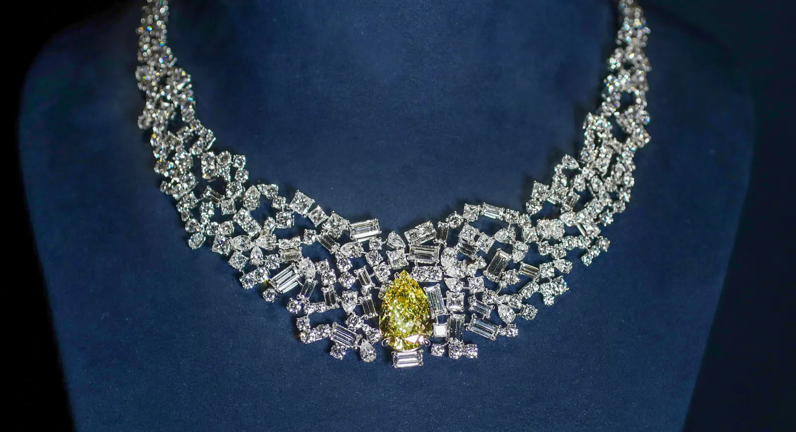 On many Dior pieces of Haute Couture clothing, you will find a decorative horizontal band running along the garment, one that is often floral – in celebration of Christian Dior’s beloved childhood garden. In homage to this noted Dior detail, de Castellane uses lines of assembled pear and round-cut stones in a claw setting to recreate these floral friezes. Together, the round bodies of the gems form the shape of flowers with the tip of the pear-shaped stones acting as the elongated shape of petals as they open from their round-brilliant pistils. The Dior Délicat necklace featuring a 4.51-carat pear-shaped yellow diamond perfectly illustrates the use of this technique. A jigsaw pattern made of white diamond flowers leads the viewer’s eye to a singular coloured sapphire.