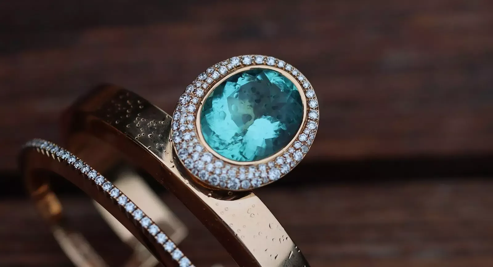 Jochen Leën jewellery pieces with Paraiba tourmaline, diamonds and original Martian meteorites set in yellow gold