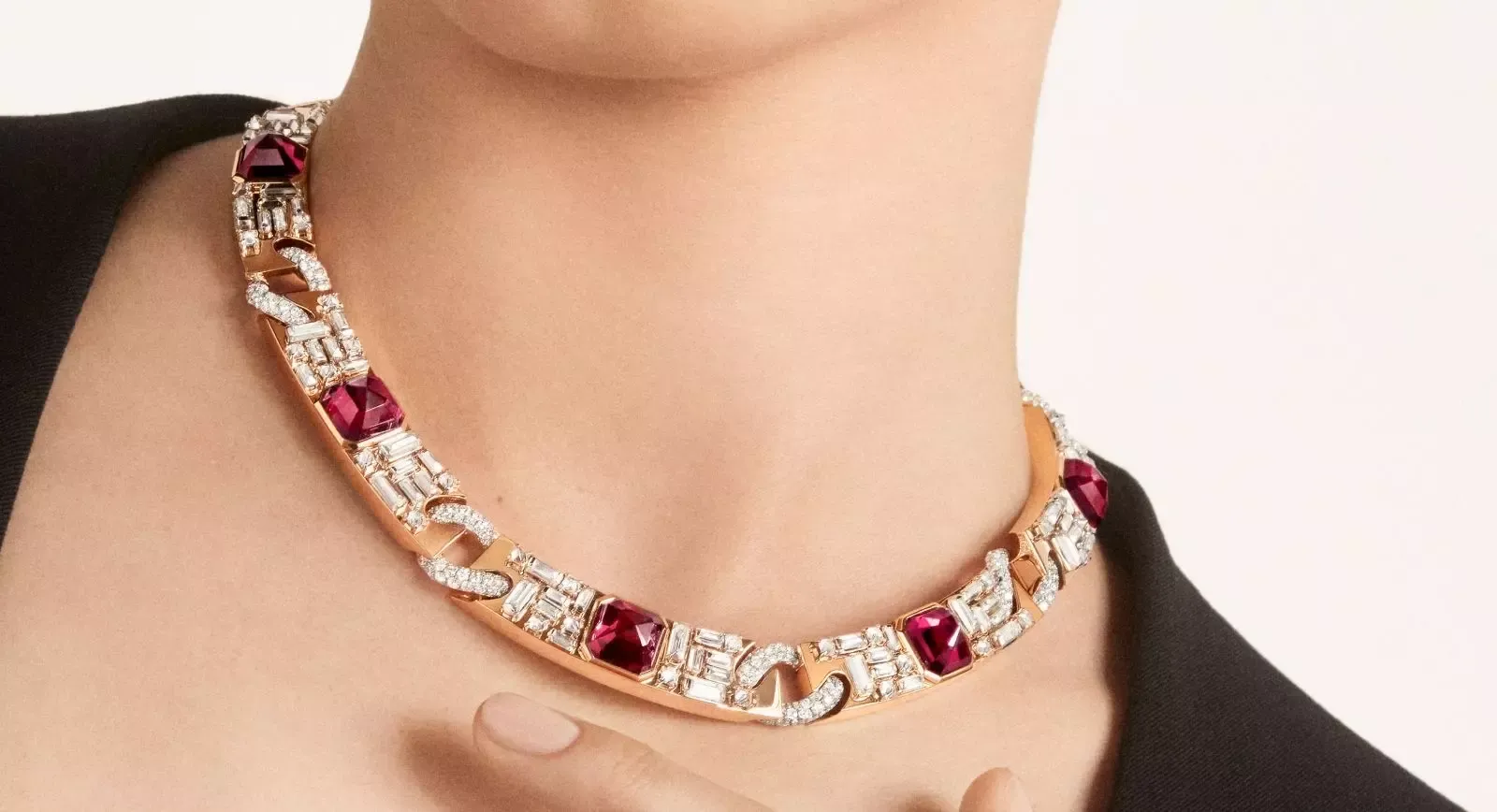 The second chapter in Pomellato’s latest high jewellery collection, Contemporary Heritage, celebrates the city’s eclectic history, its intriguing cache of hidden treasures, and how its historical monuments have directly inspired the designs at Pomellato. The Castello necklace featured in this chapter is a reinterpretation of an ancient fortification in this historic city using precious metals, coloured gemstones and Pomellato design motifs. This piece captures the imposing carved stone façade of one of Milan’s most iconic historical sites – the Castello Sforzesco, a 15th-century fortification built by the Duke of Milan, Francesco Sforza. The Castello necklace combines the imposing shape of the castle with a design from 1972, found in the Pomellato archives, to showcase the brand’s signature gourmette chain link. This unique chain style was invented by the founder of Pomellato, Pino Rabolini, when women’s fashion was moving away from the formal wardrobe towards a more liberated and effortless style of dressing. This chain is equal parts femininity and versatility, with its curved shape strong enough to empower any outfit yet providing a breezy approach to accessorising. The necklace is made of plates of rose gold joined together by chunky gourmette links adorned with 28 carats of baguette, princess, and brilliant-cut diamonds, alongside five reverse-set rubellites totalling over 29 carats.
